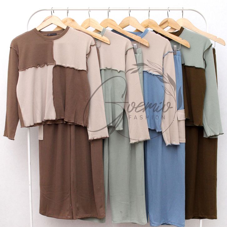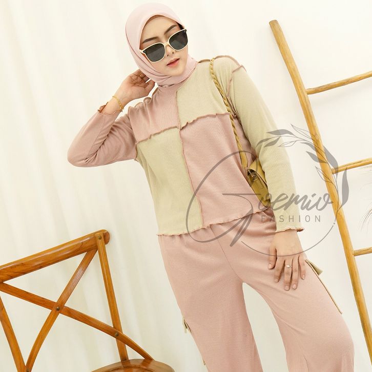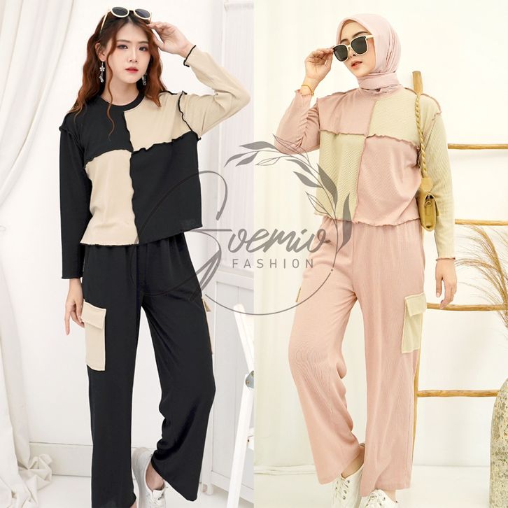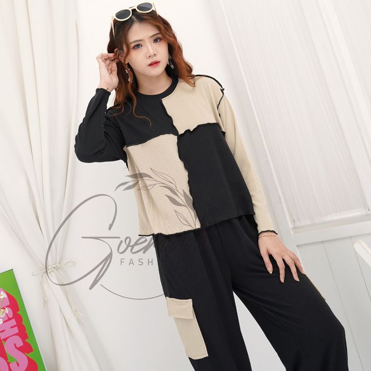 One Set Sunday Setelan KATUN KNIT Multicolor Atasan Dan Celana Cargo Panjang Wanita Polos Lengan panjang