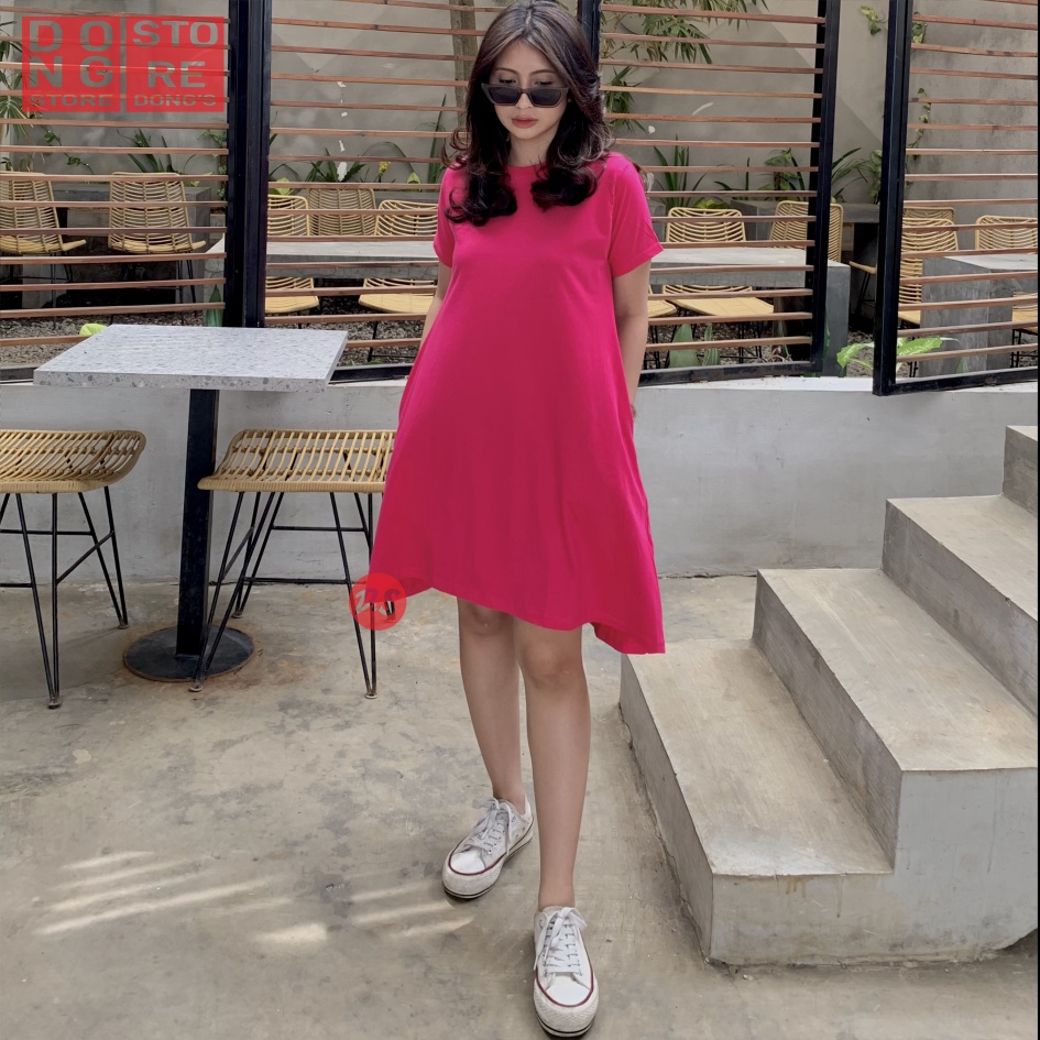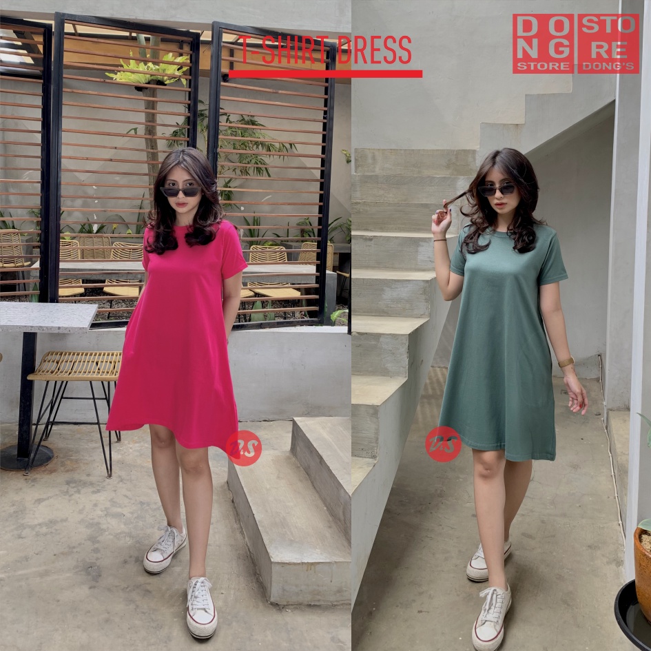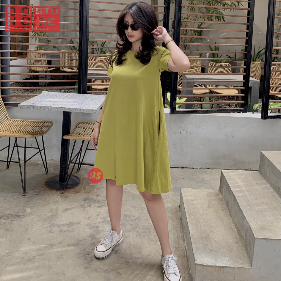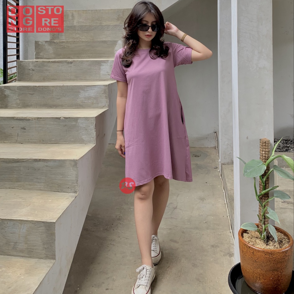 KAOS POLOS DRESS POCKET WANITA CASUAL FASHION KOREAN BAJU ATASAN MIDI DRES SAKU DIDUA SISI