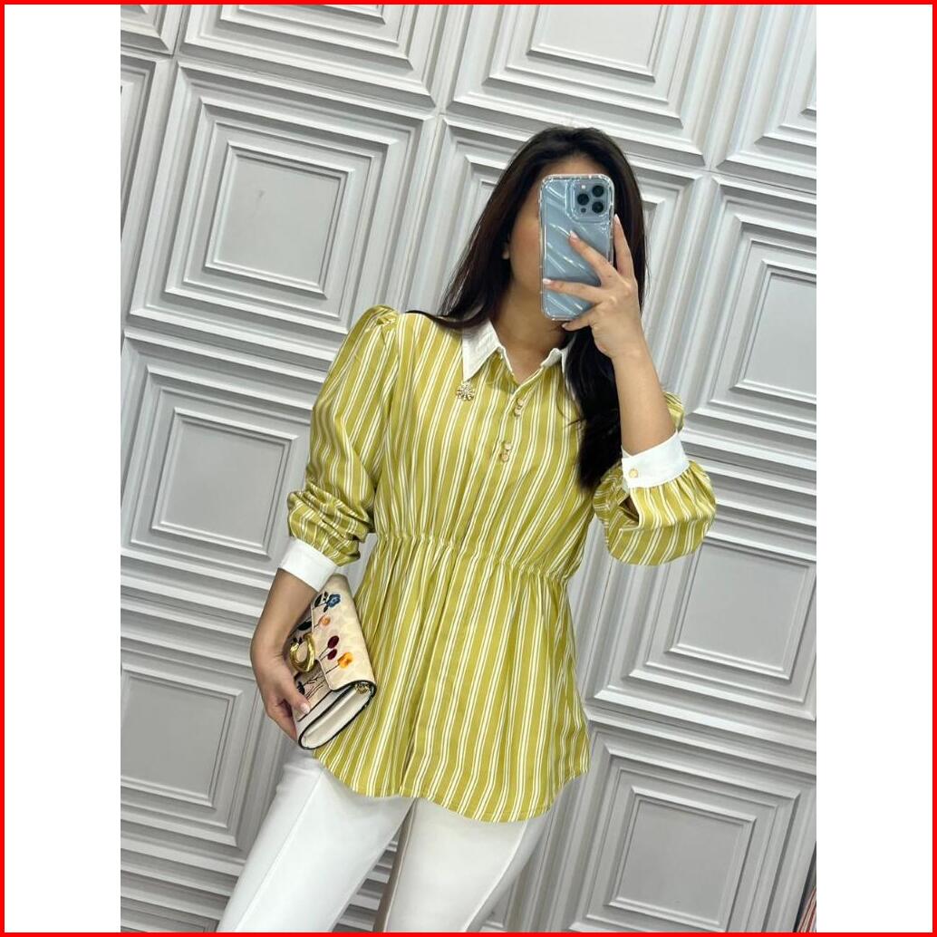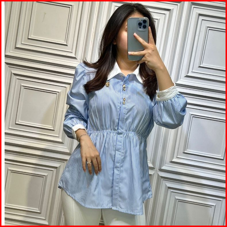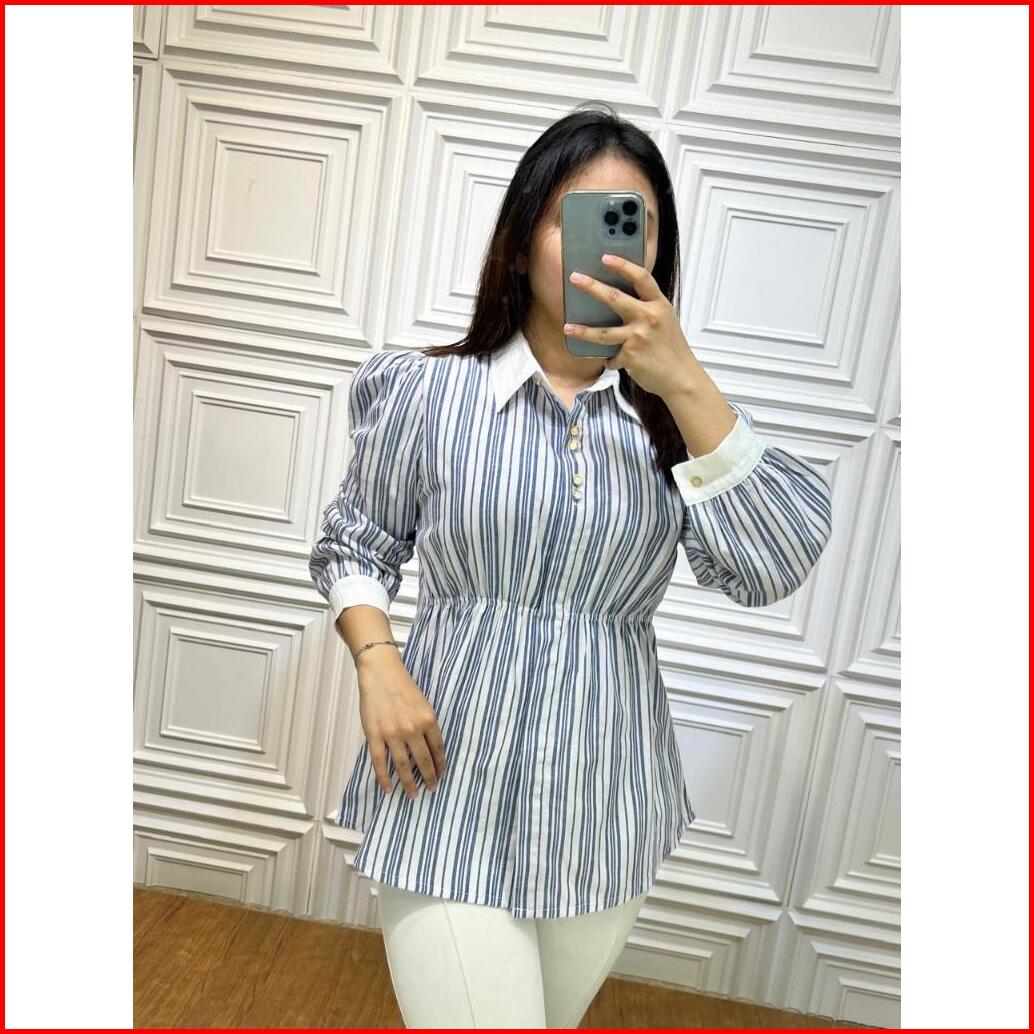 Jolin Mina Kemeja Motif Salur Bahan Katun Free Bross Hanya Kerut Depan