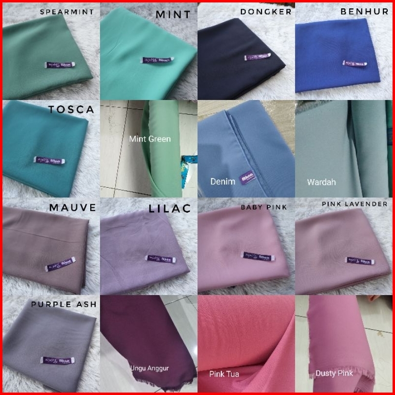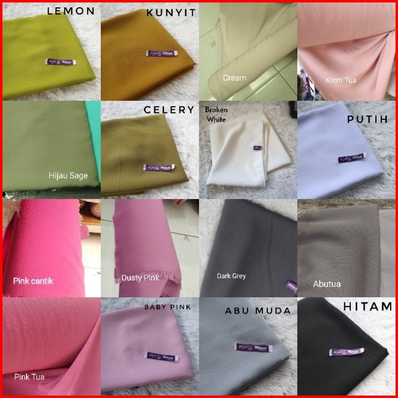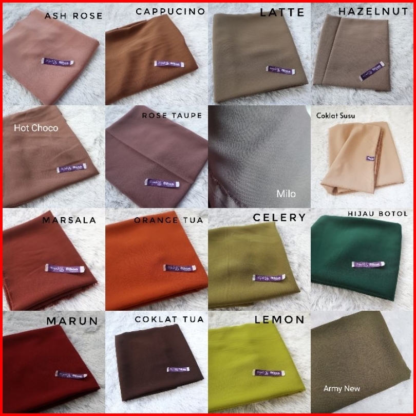 Hitam, Abutua, Kunyit, Abu Muda, Ash Rose, Baby Pink, Cappucino, Celery, Coklat TUA, Dustypink, Denim, Dongker/Navy, Petrol Blue, Army (new), CARAMEL, Hijausage, Hazelnut, Hot Choco, Krem Tua, Lemon, Latte, Lilac, Mint, Mintgreen, Mauve, Milo, Merahbendera, Marun, Marsala, Orange Tua, Pink Tua, Pinklavender, Putih, Purple Ash, Rose Taupe, Spearmint, Ungu Anggur, Wardah, Tosca, Coklat SUSU, Hijau Botol, Darkgrey GELAP, Benhur, Biru Langit, Orchid, Emerald, Putih Tulang, Cream, Biru Elektrik, Ungu Violet, Biru Muda, Alpukat, Fanta, Mustard