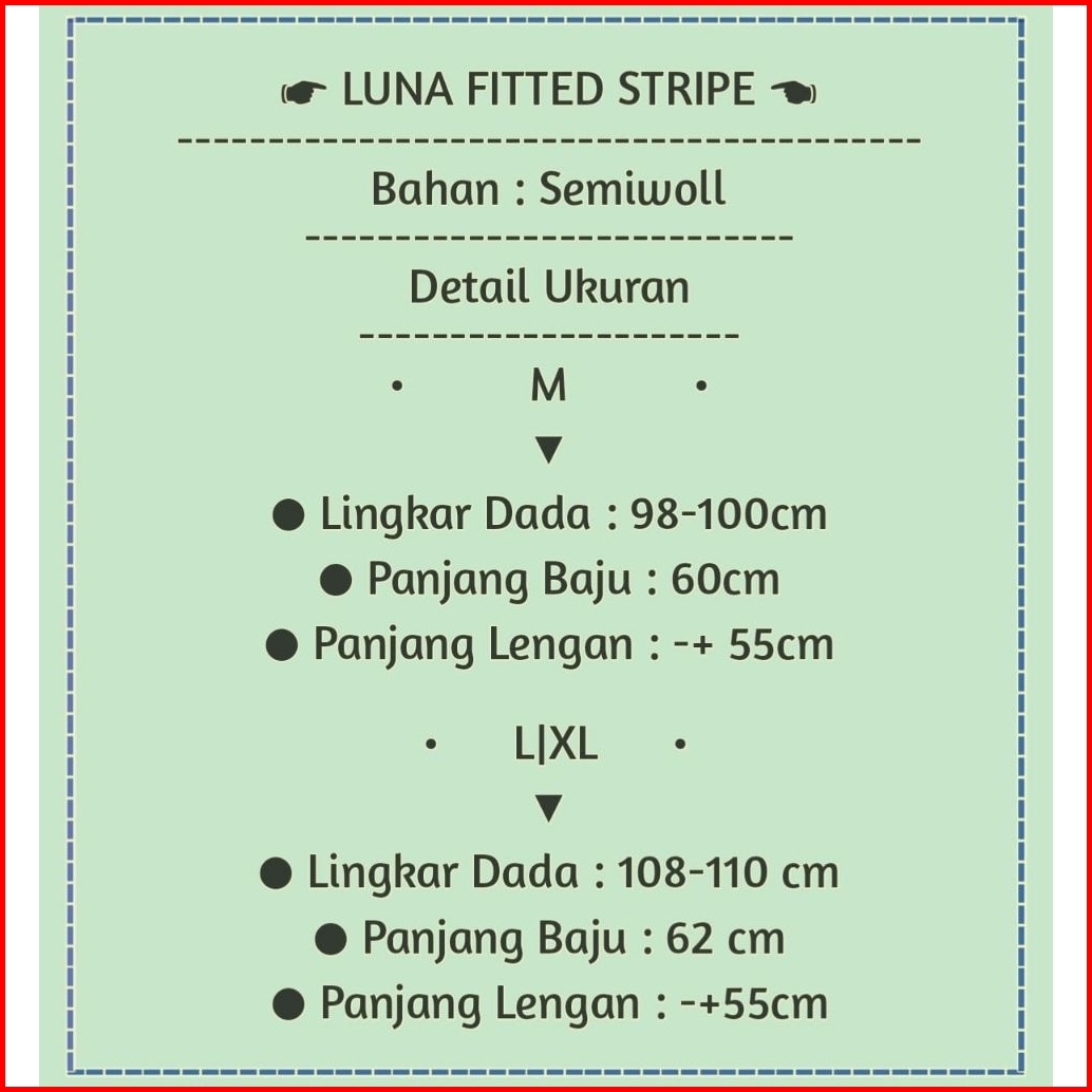 Hitam, Broken White, Turkis, Lemon, Fusia, Ijo botol, Latte, Denim, Baby blue, Sage, Mint, Lilac, Maroon, Teracota, Blue elektric, Dasty pink, Ivory, Abu, Avocado, Hitam stripe (Luna), Putih stripe (Luna), Marun stripe (Luna), Navy Stripe (Luna), Grey stripe (Luna), Mahogany Stripe, Denim stripe (Luna)