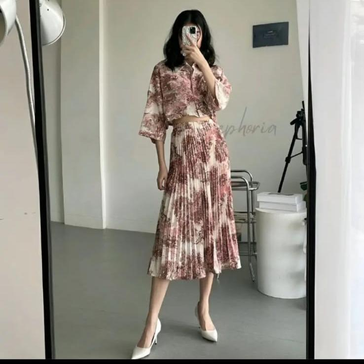 ONE SET WANITA NATURE KOREAN VINTAGE KEMEJA CROP & ROK MIDI PLISKET
