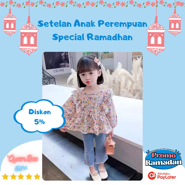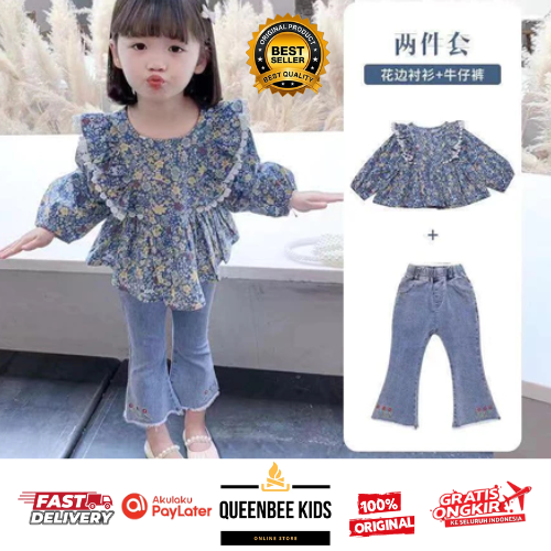 Setelan Anak Perempuan import 3-12 Tahun / Set Jeans Anak Perempuan Kemeja Floral Bunga / Stelan Anak Cewe Korea Style