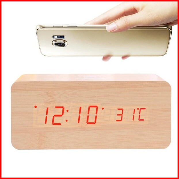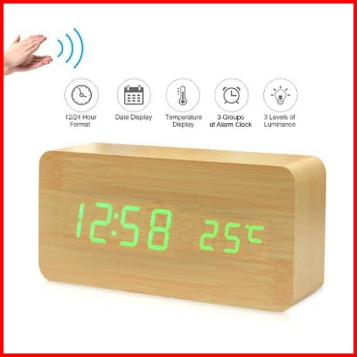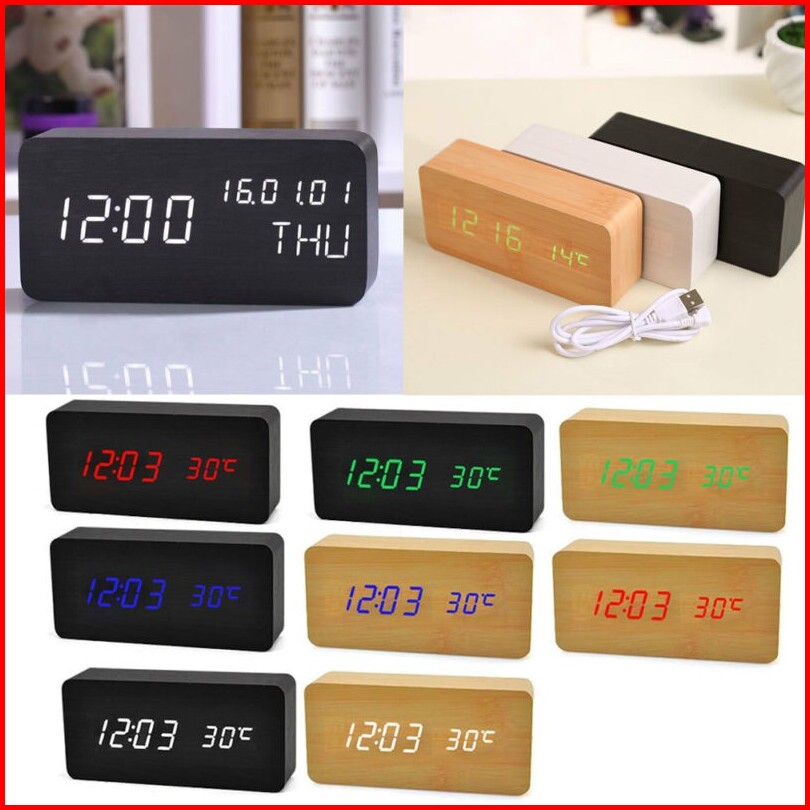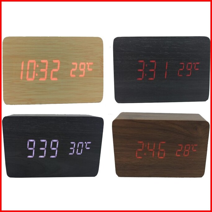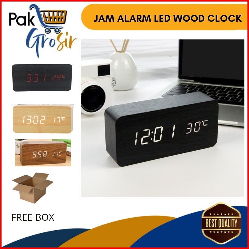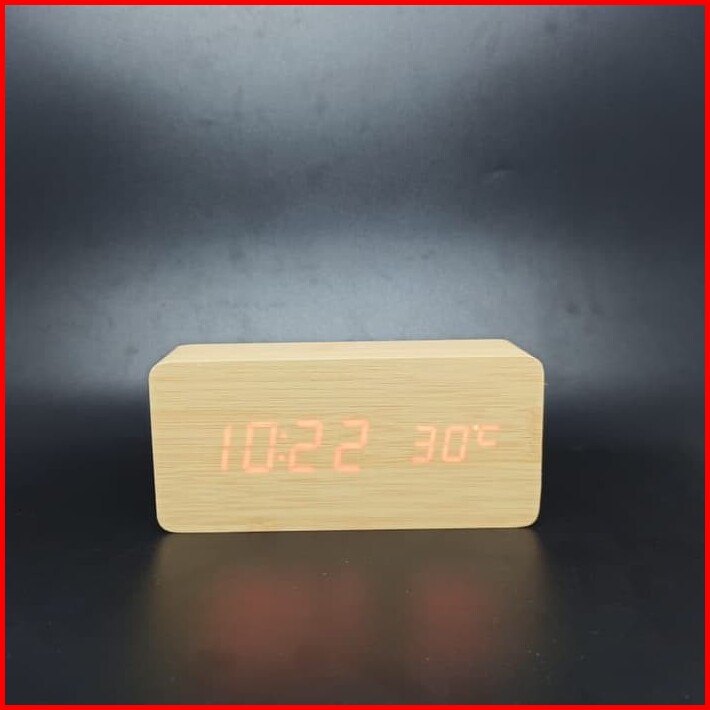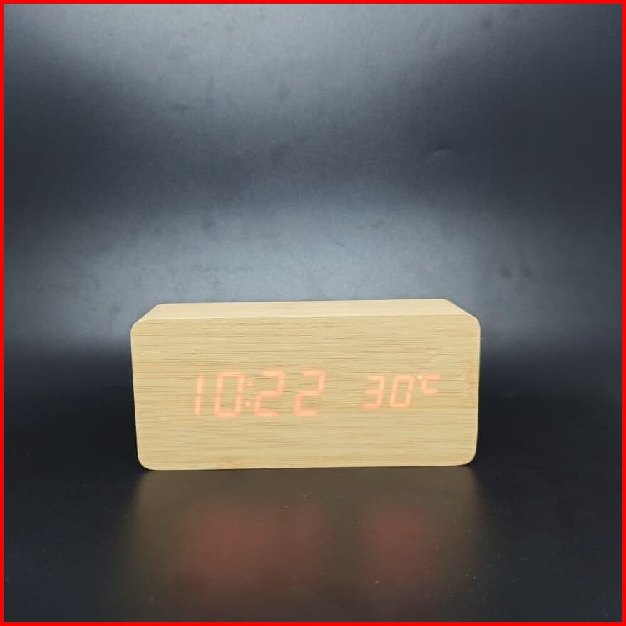 Jam Alarm Digital Led Wood Meja Motif Kayu Temperatur Clock Dan Baterai