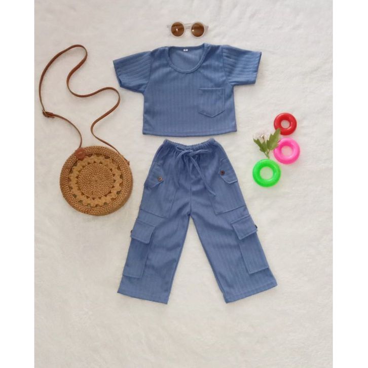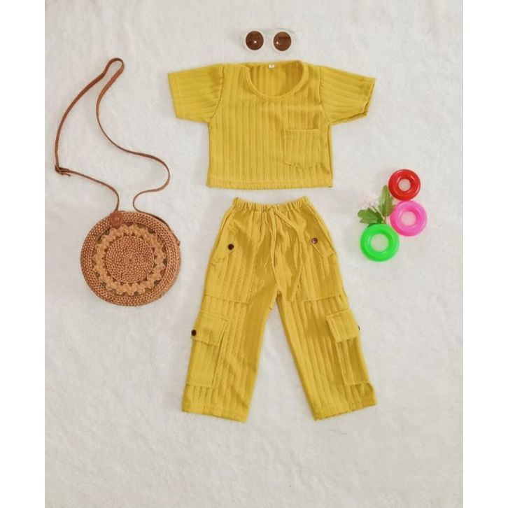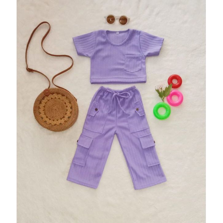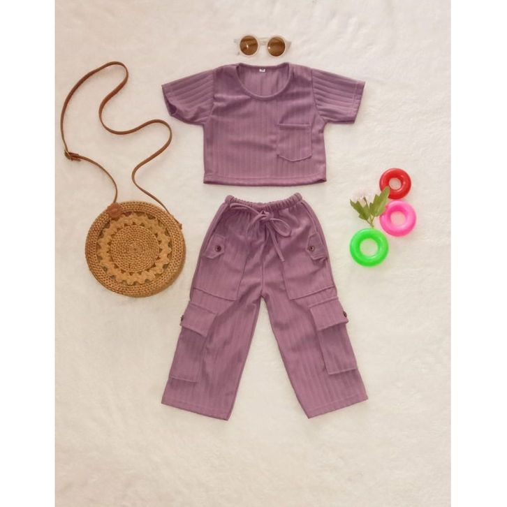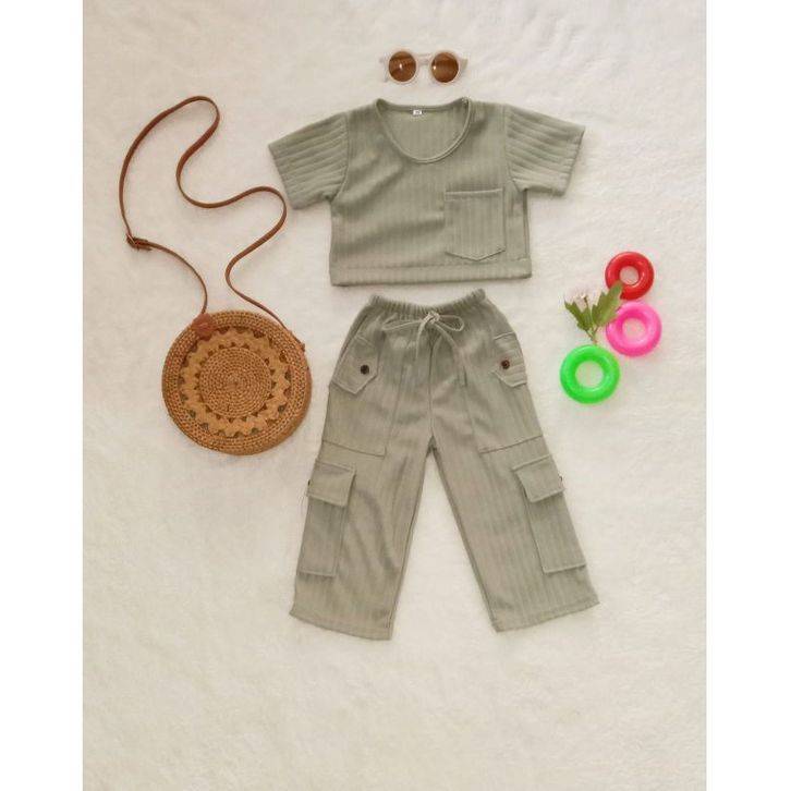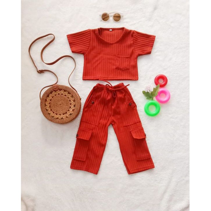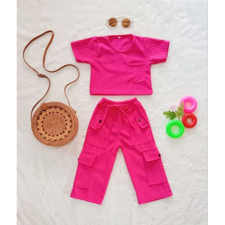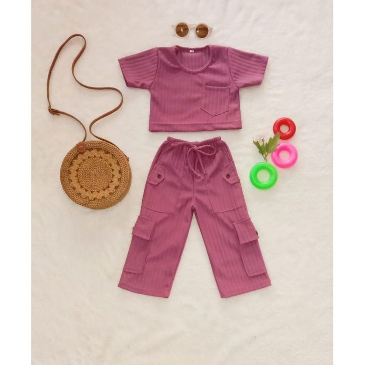 BAJU ANAK PEREMPUAN PROMO SETELAN ANAK CELANA CARGO BAJU LENGAN PENDEK HORNET KNIT TERMURAH KEKINAIAN