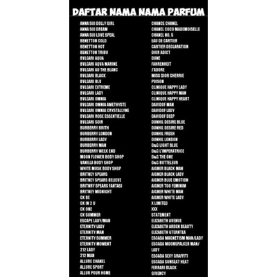 Avril Lavigne, Angel heart, Anna Sui dream, Aigner blue, Nagita slavina, Black opium, Britney fantasi, Midnight fantasi, Baccarat, D4nhil blue