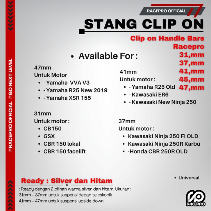 [Mall] CLIP ON HANLDE BARS RACEPRO STANG CLIP ON RACEPRO 31-37-41-47 STANG MOTOR CBR R15 R25 NINJA