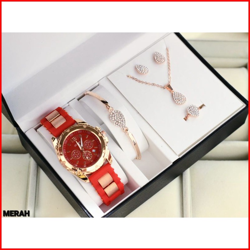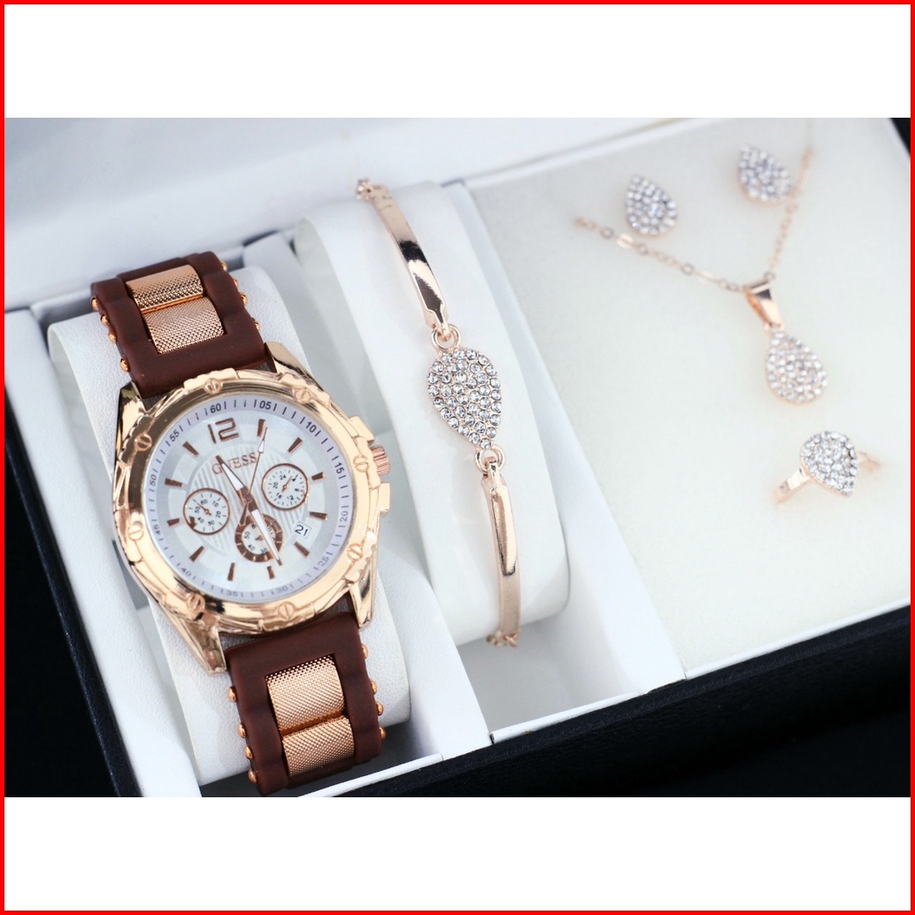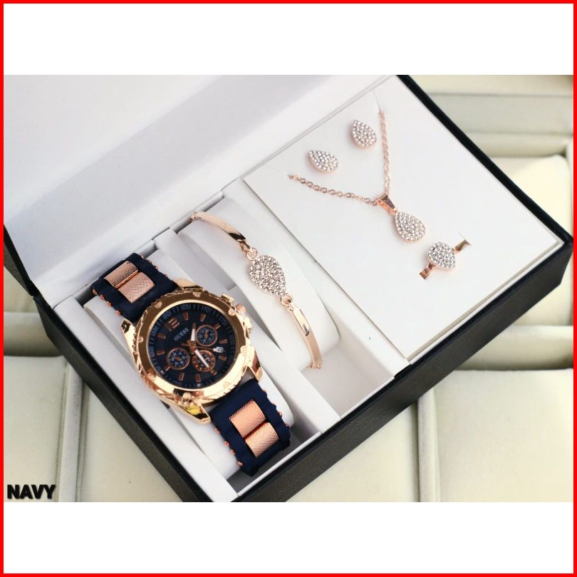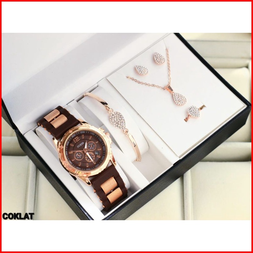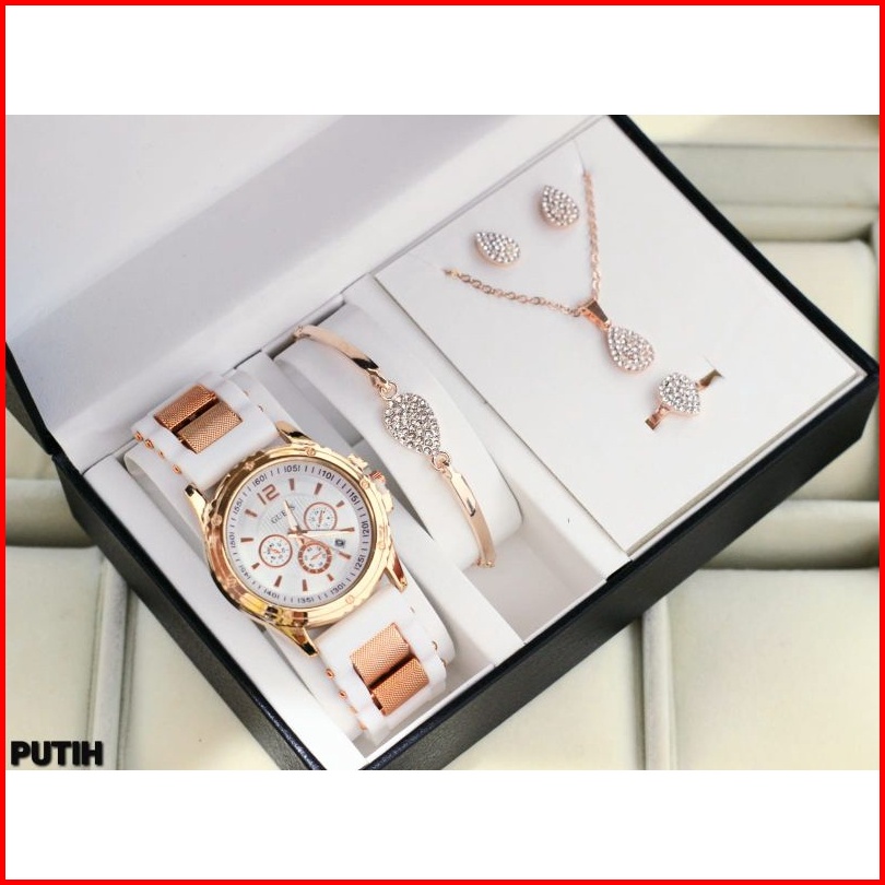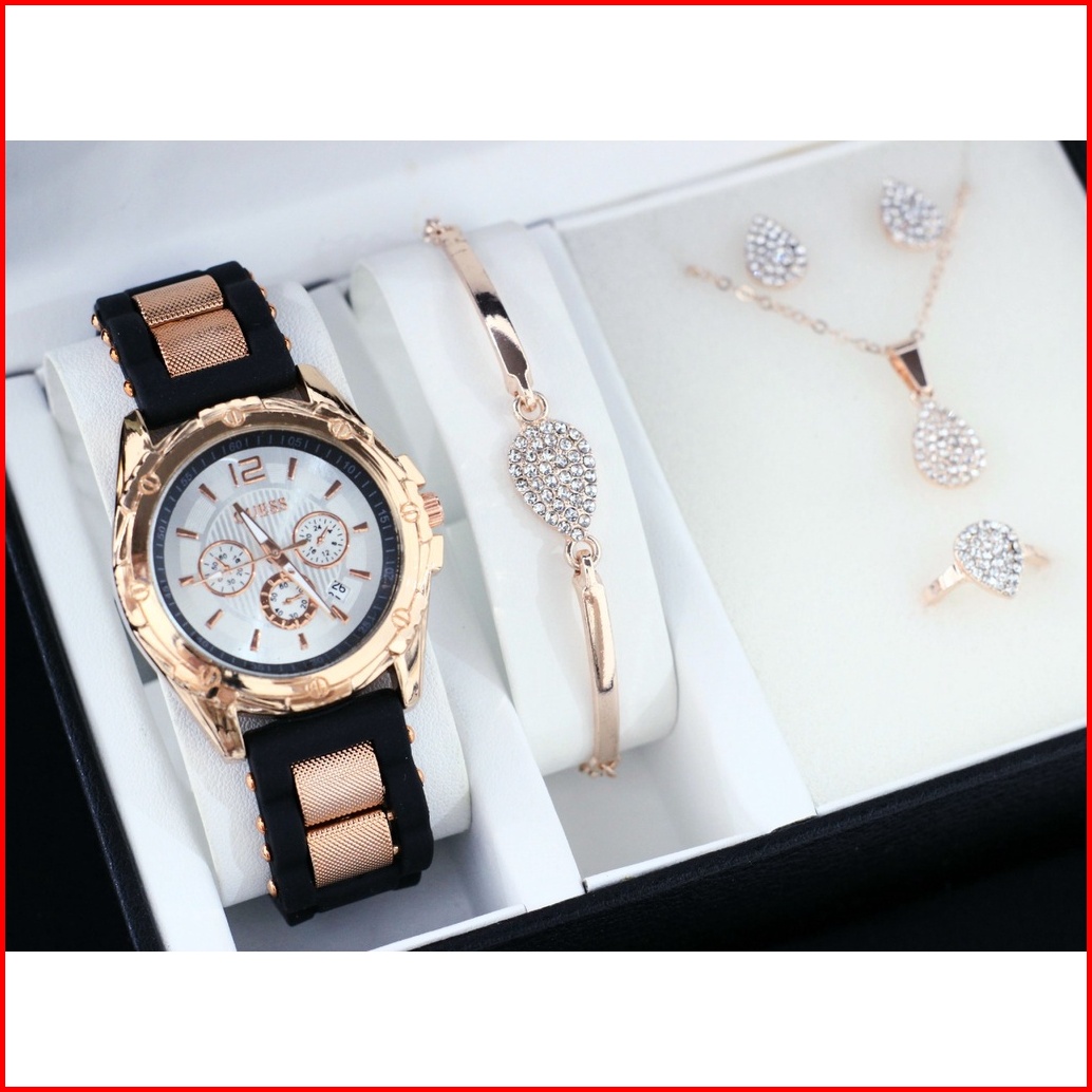 Jam Tangan Wanita Guess Rubber Free Gelang Cincin Kalung Anting Gns-9321