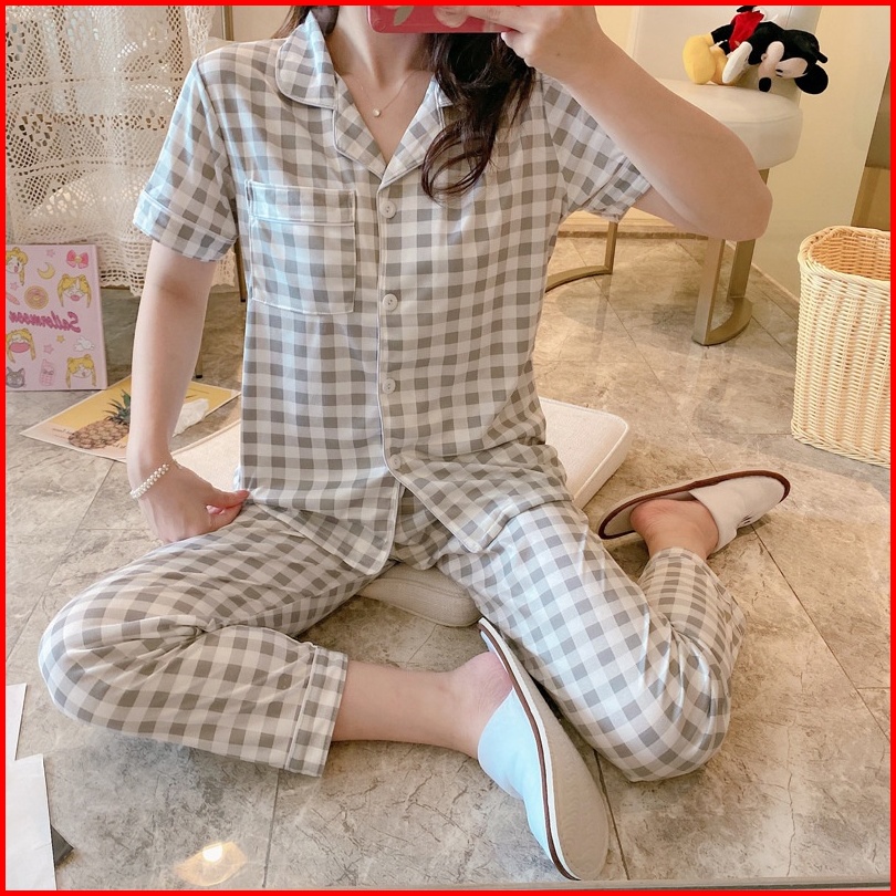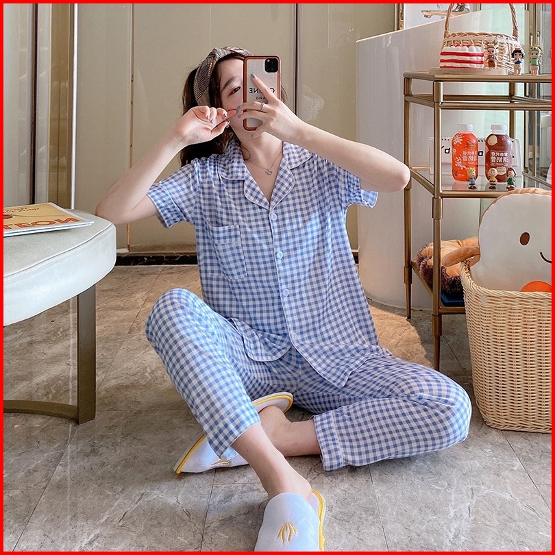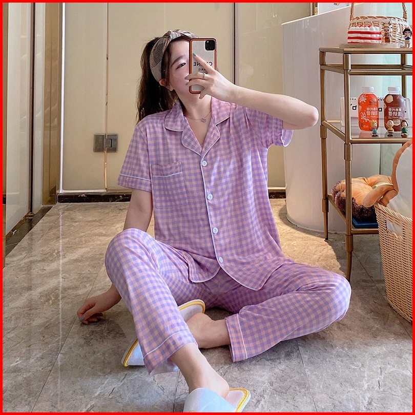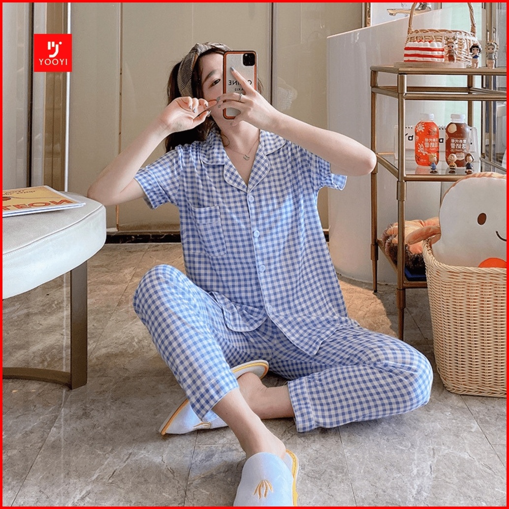 Yooyi Baju Tidur Wanita Piyama Cewek Set Kemeja Lengan Pendek Celana Panjang Style Korea Jumbo Dewasa Remaja98776tr Prem