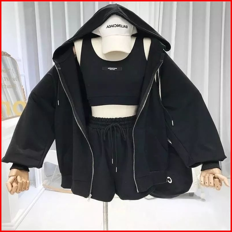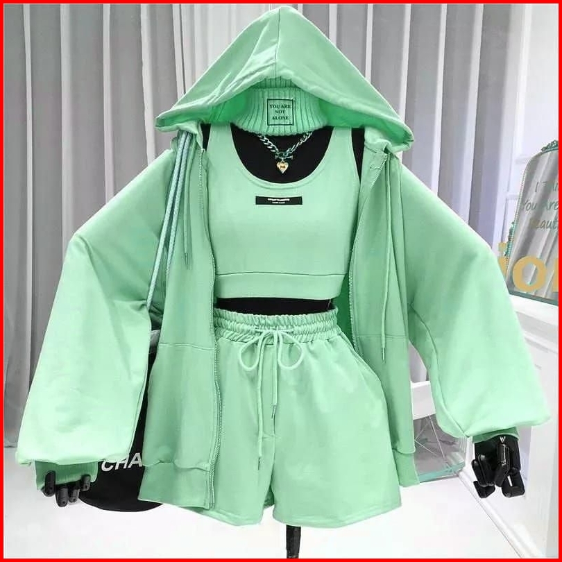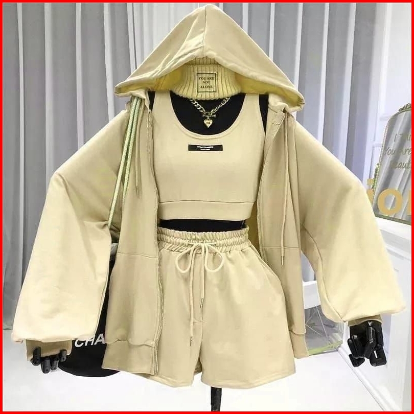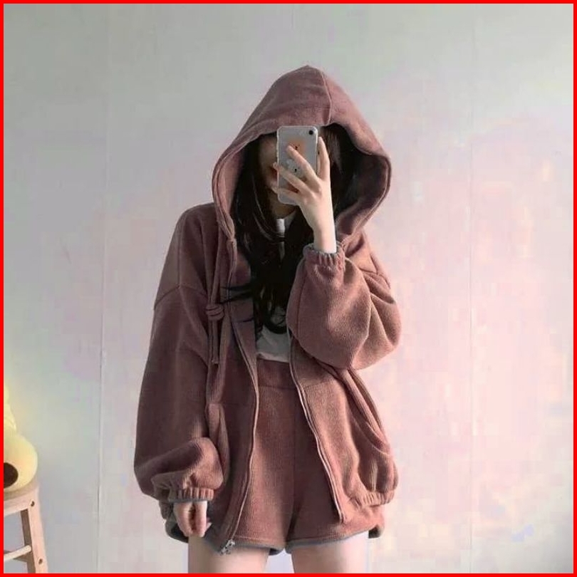 Setelan Wanita Zora One Set 2in1 Jaket Pants No Tanktop Korean Style One Set Hoodie Zipper Dan Celana Pendek