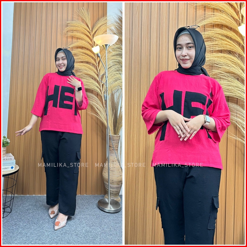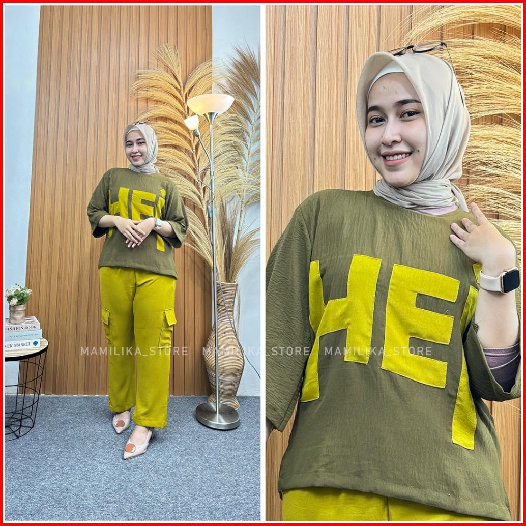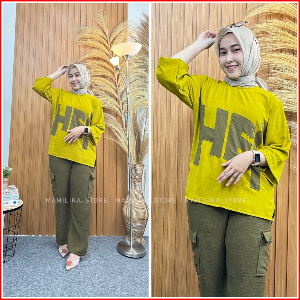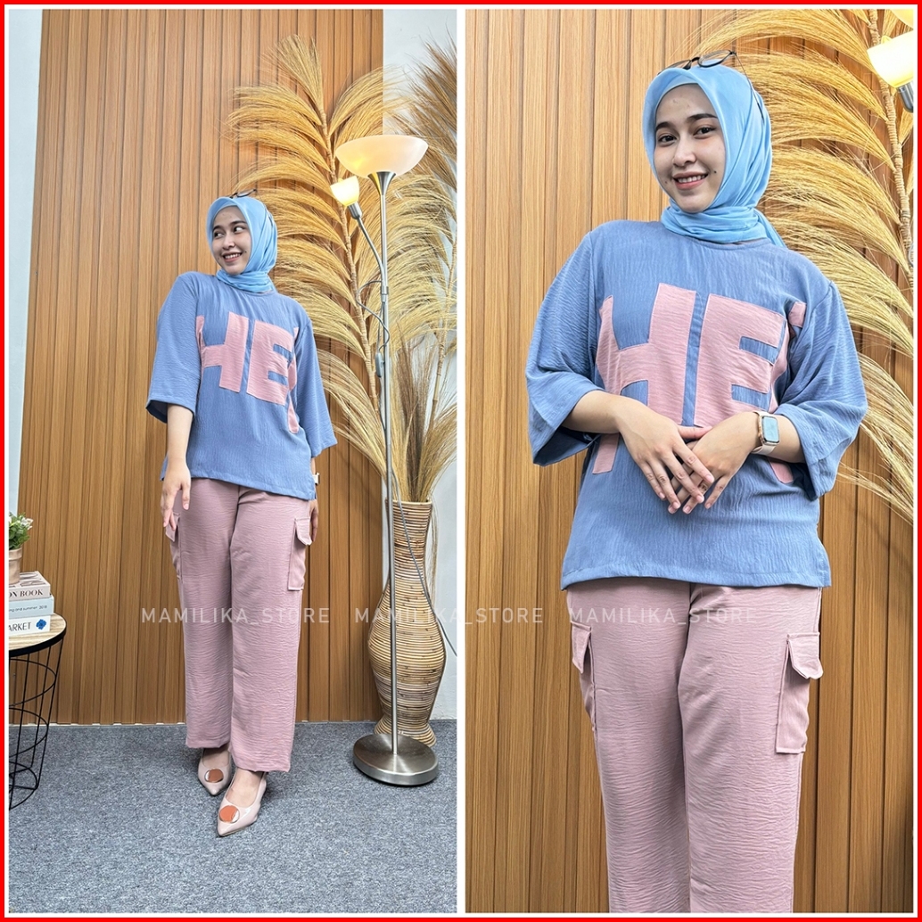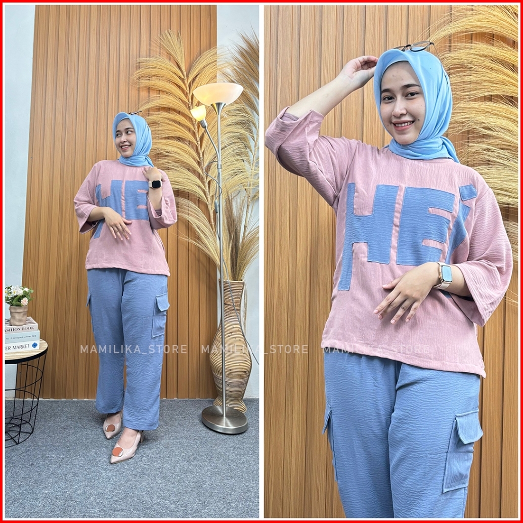 Hei One Set Cargo Baju Setelan Wanita Kekinian Crinkle Airflow