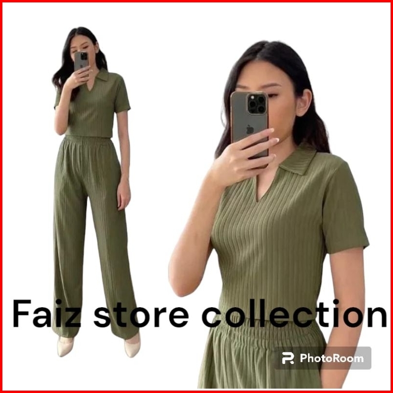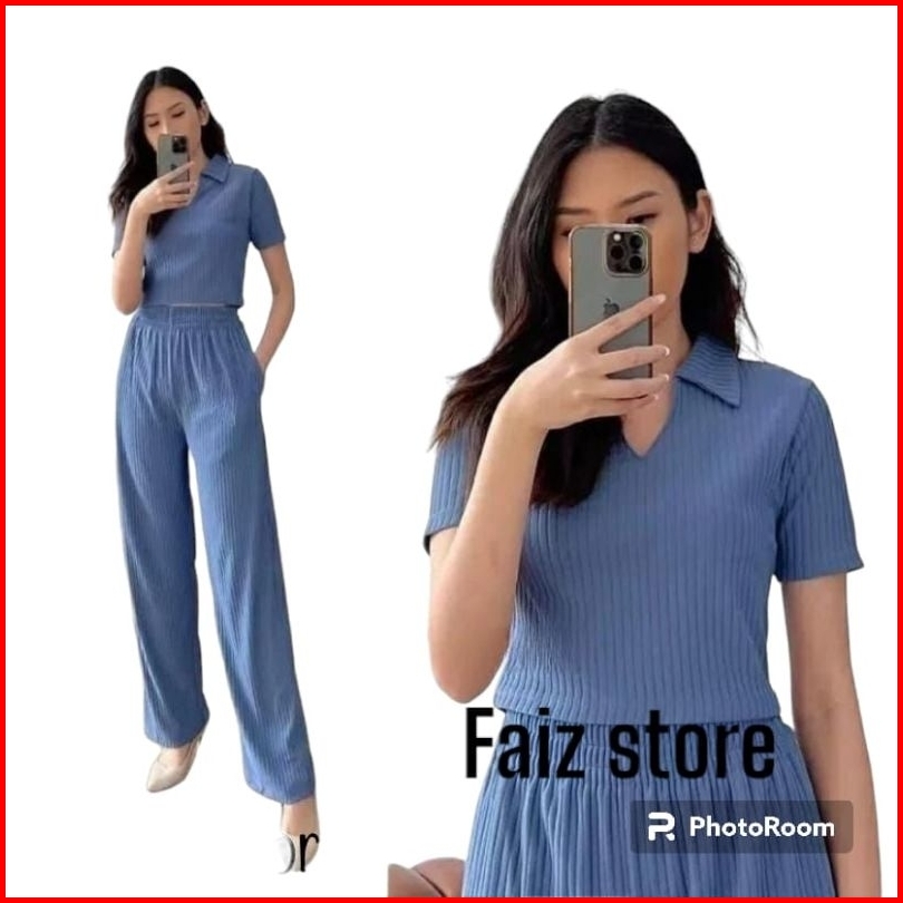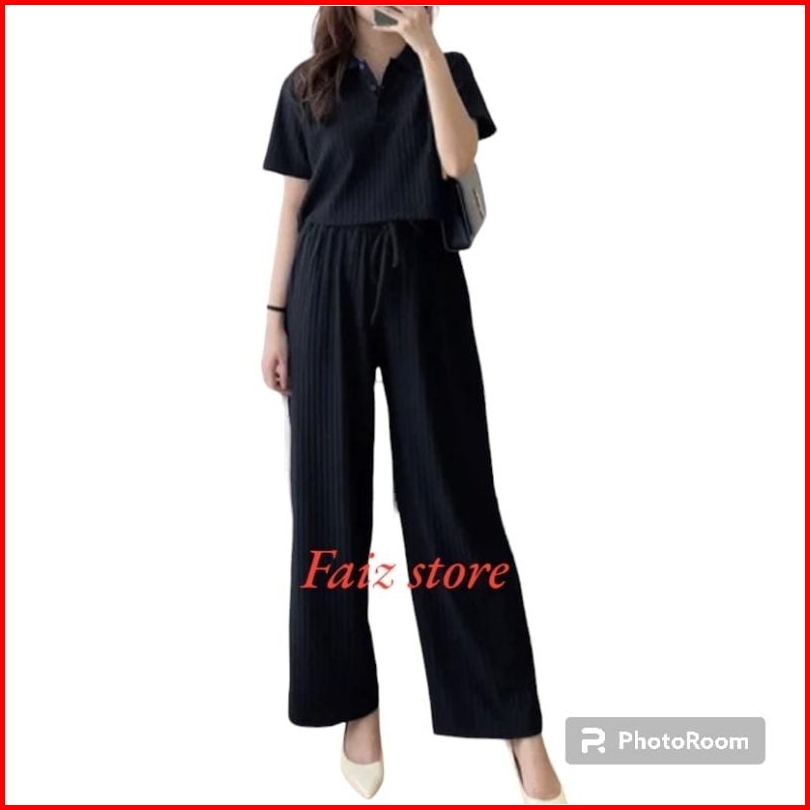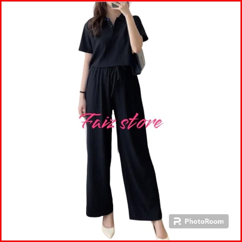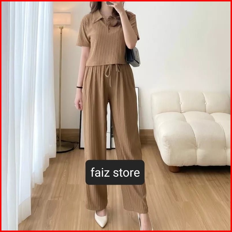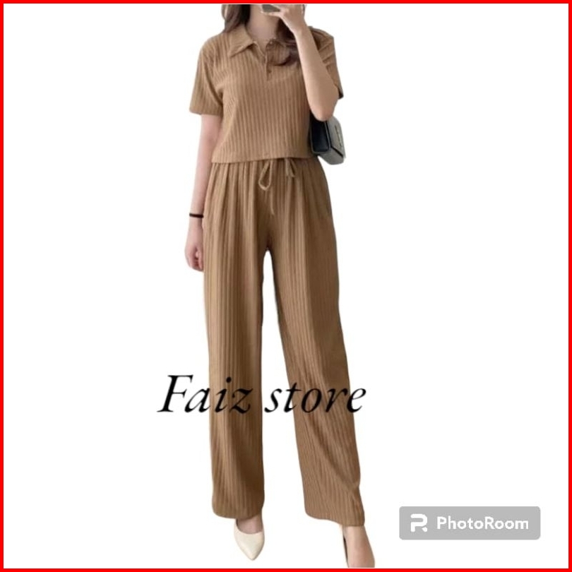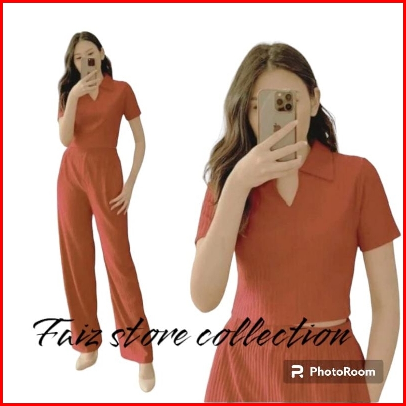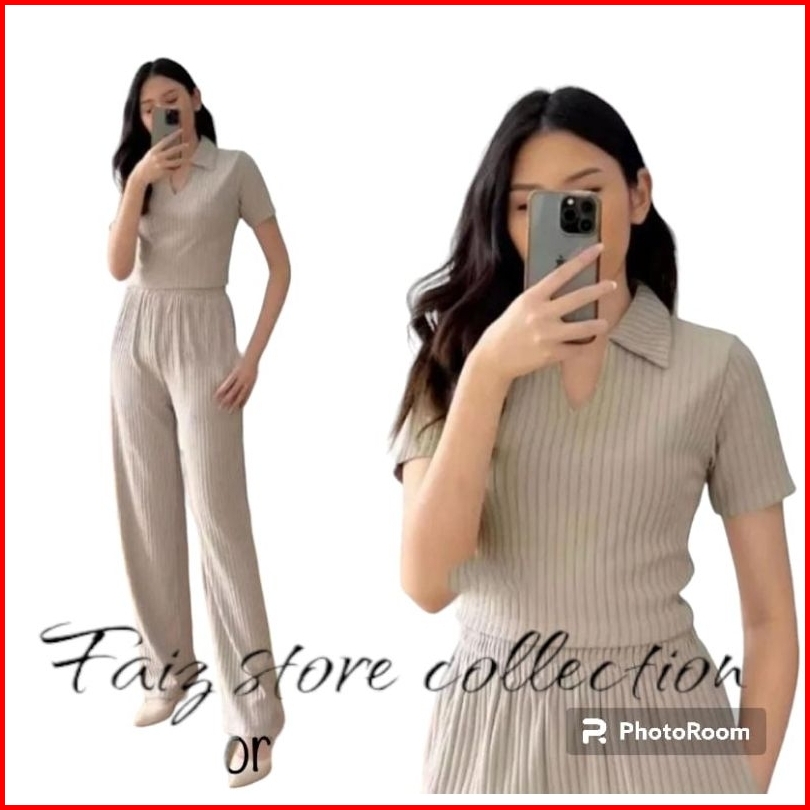 Oneset Knit Polo Celana Panjang Set Rib Knit Premium Setelan Knit Wanita Atasan Crop Polo Top Celana Knit Hornet Oneset