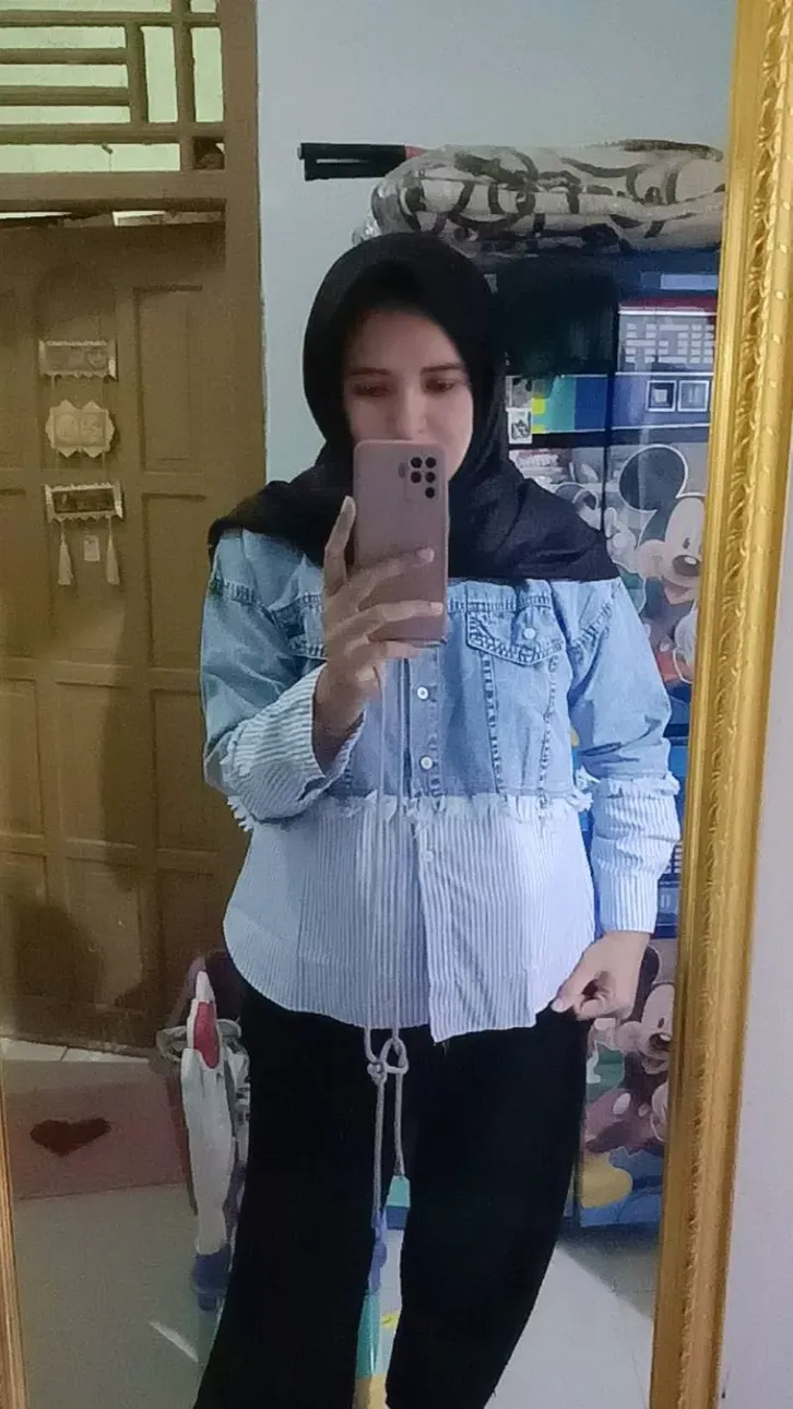 Atasan Jeans Wanita – Kemeja Denim Casual Kombinasi Salur, Snow Grey Kekinian