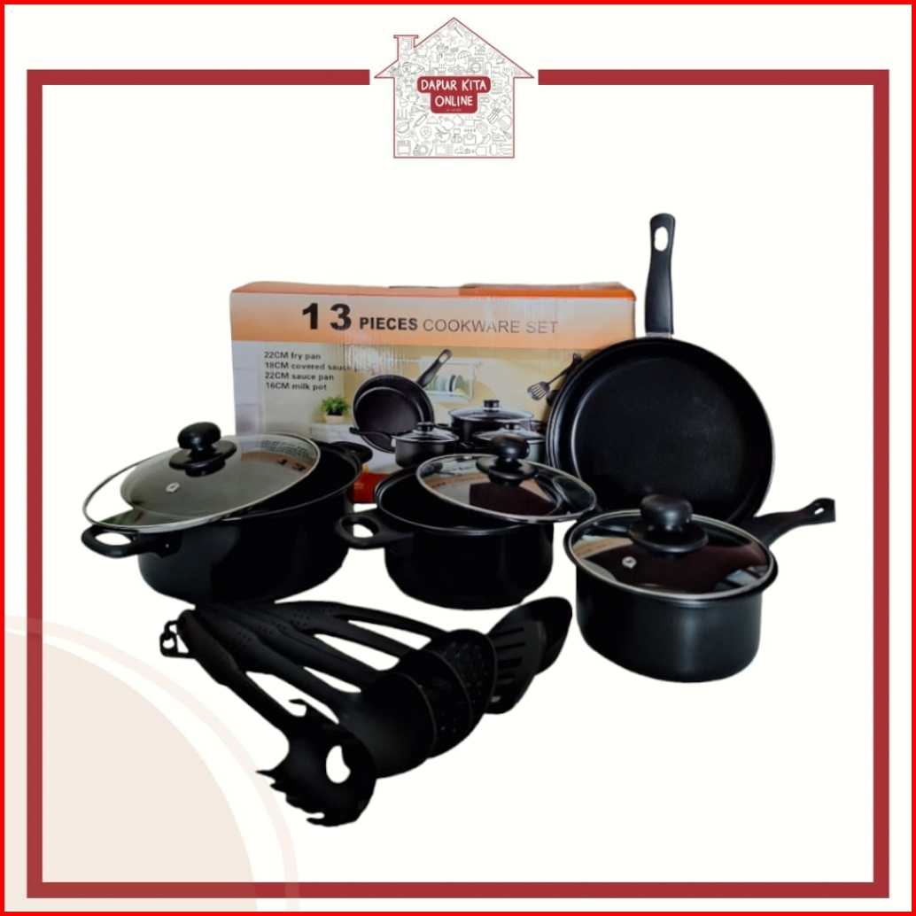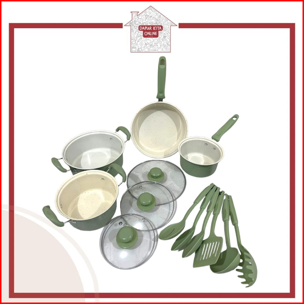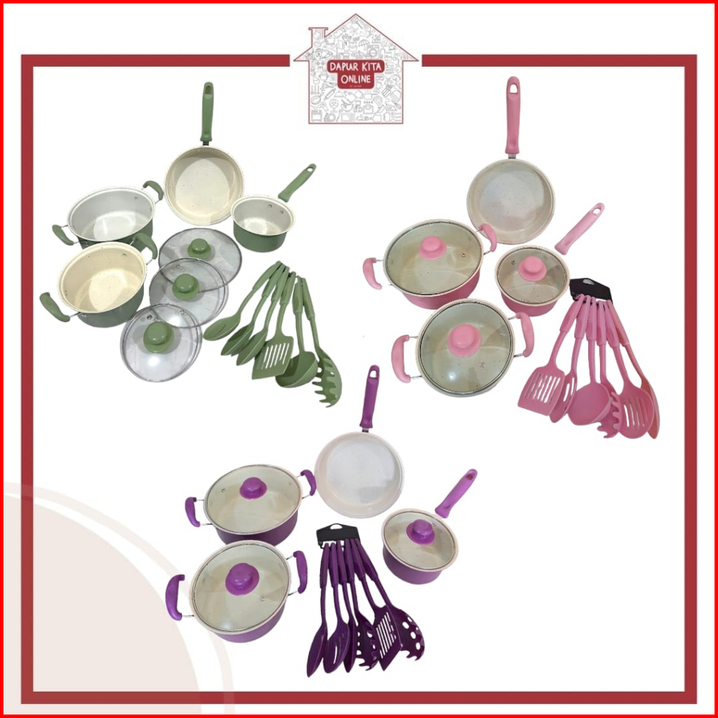 Panci Set Serbaguna 13 Pcs Cookware Marble Set Tutup Kaca Free Spatula Panci Set Telfon Anti Lengket A-0001