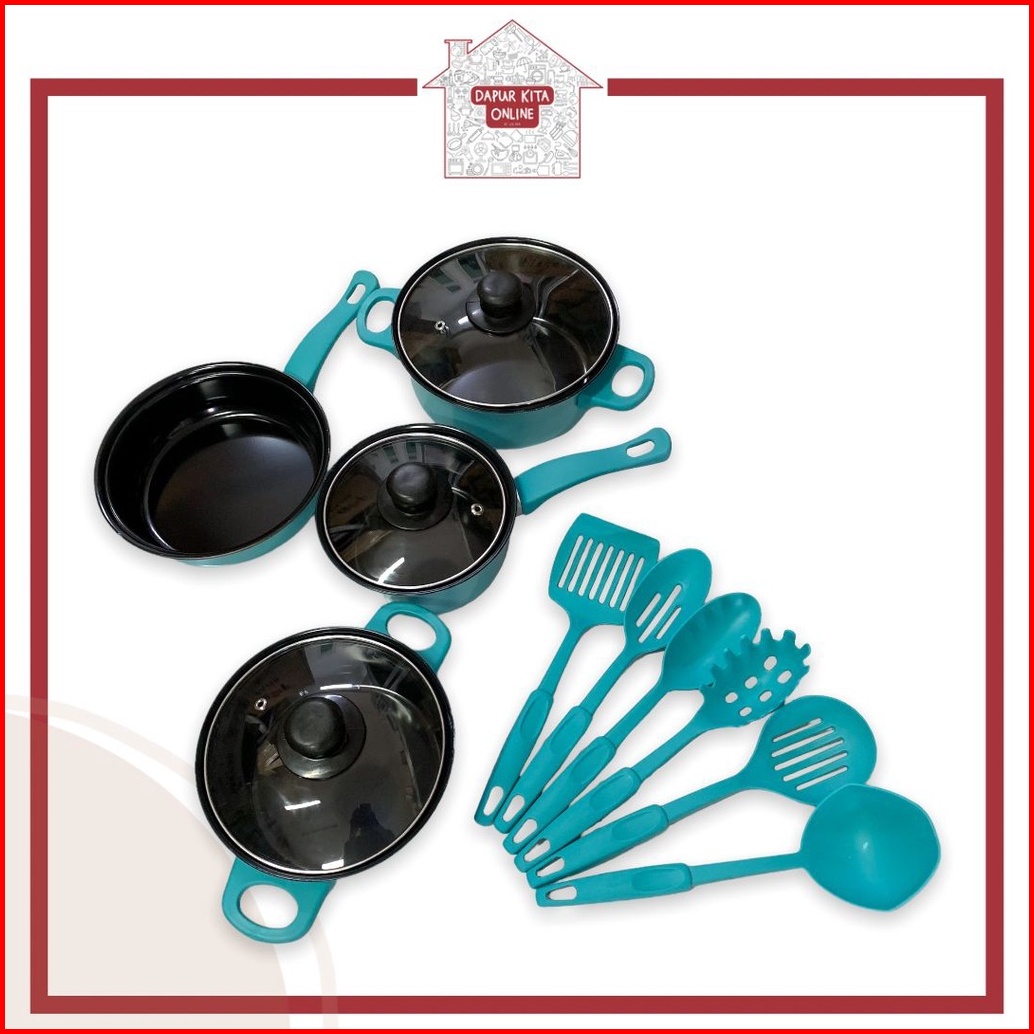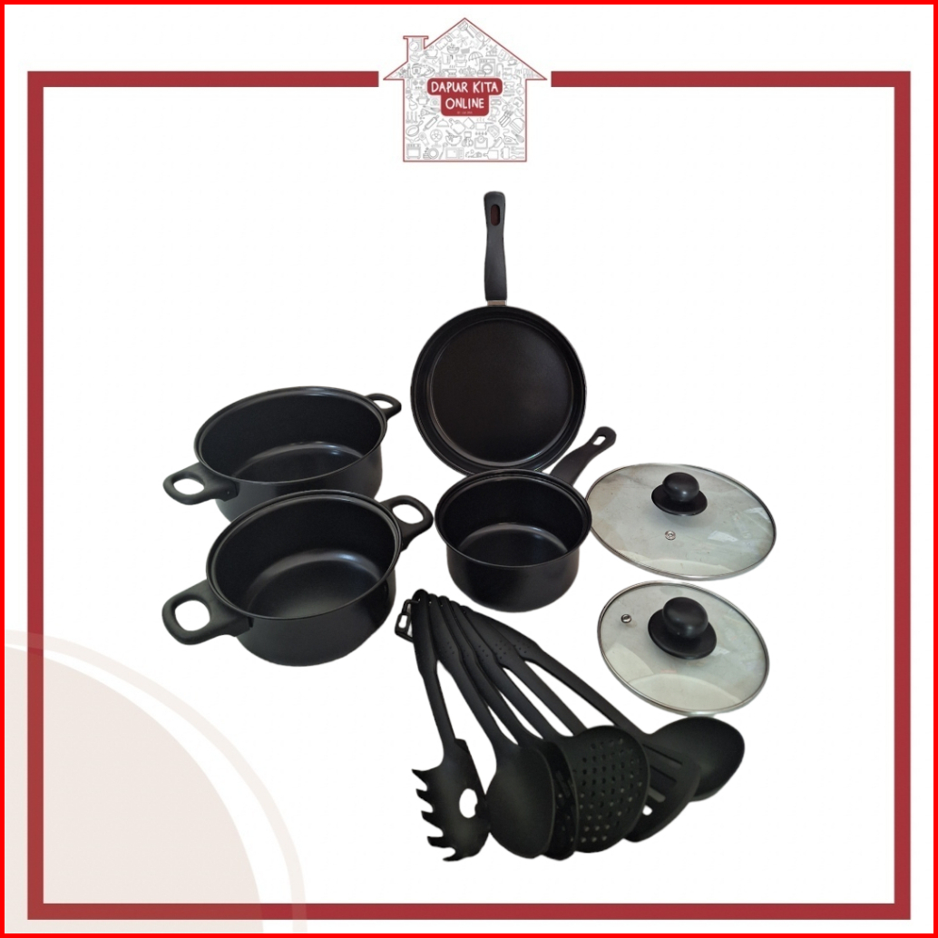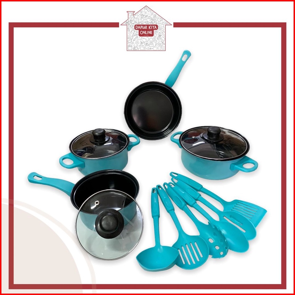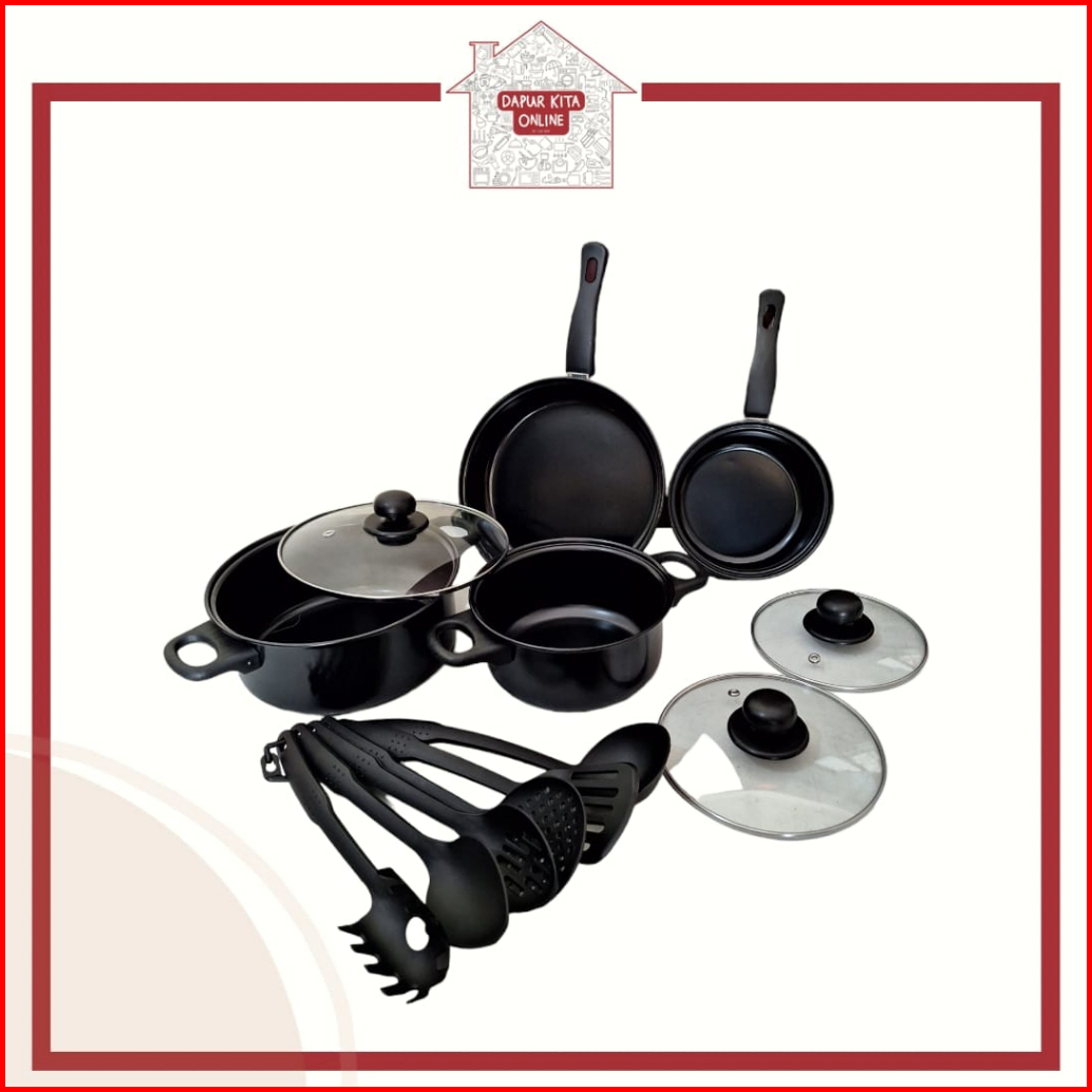 Panci Set Serbaguna 13 Pcs Cookware Marble Set Tutup Kaca Free Spatula Panci Set Telfon Anti Lengket A-0001
