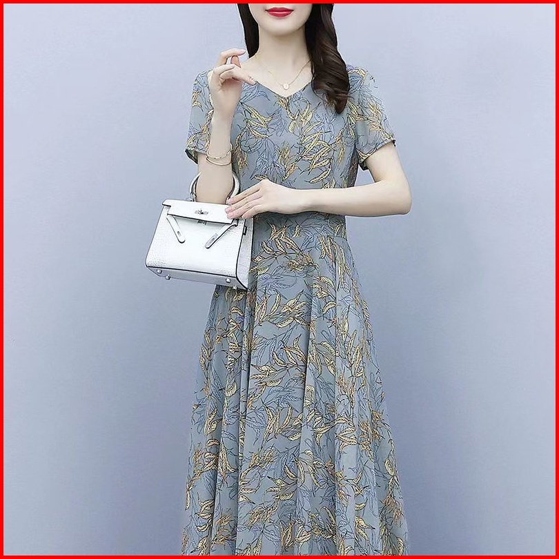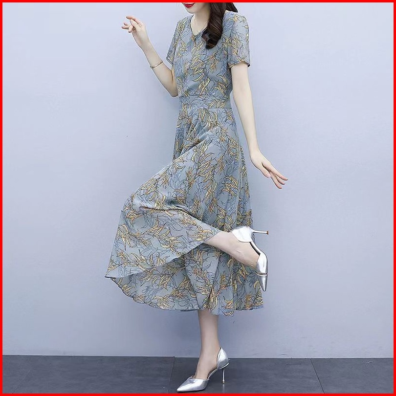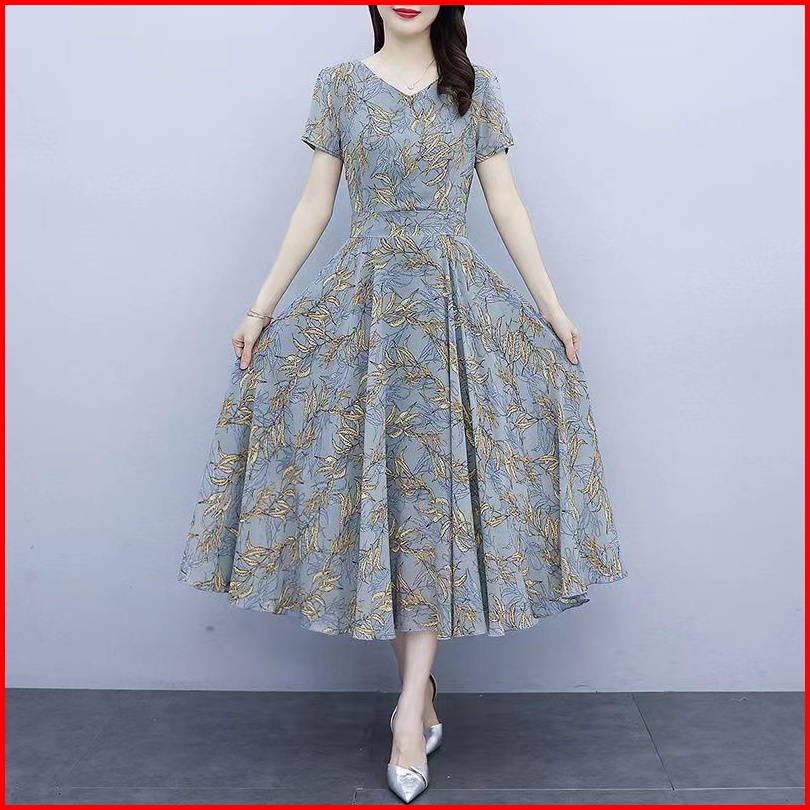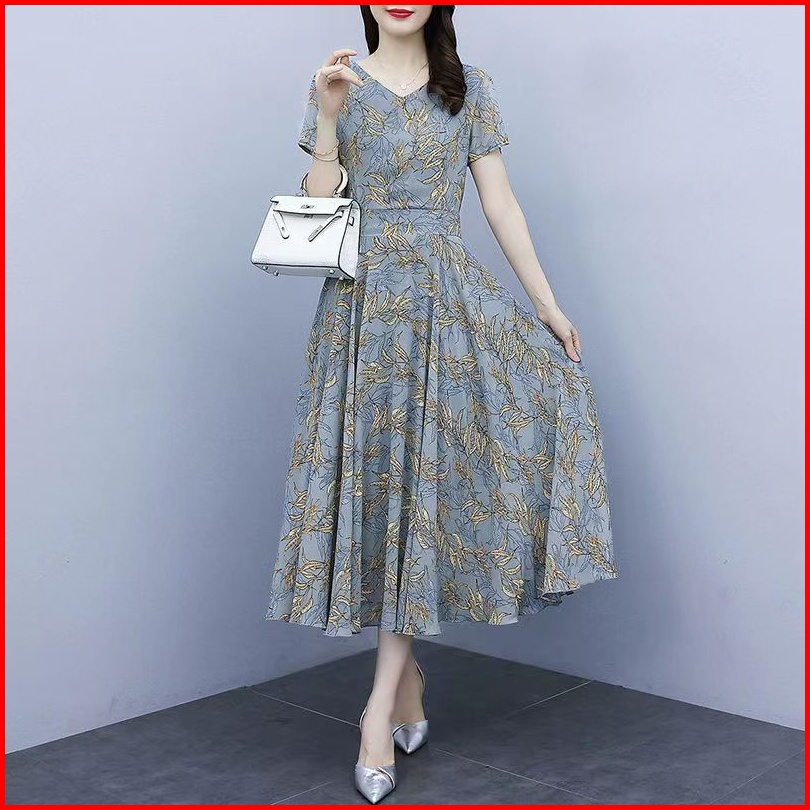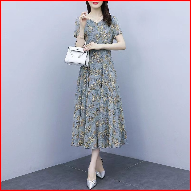 Baru Gaya Korea Lengan Pendek Gaun Panjang Yang Elegan Bunga Temperamen Rok Derss Korea