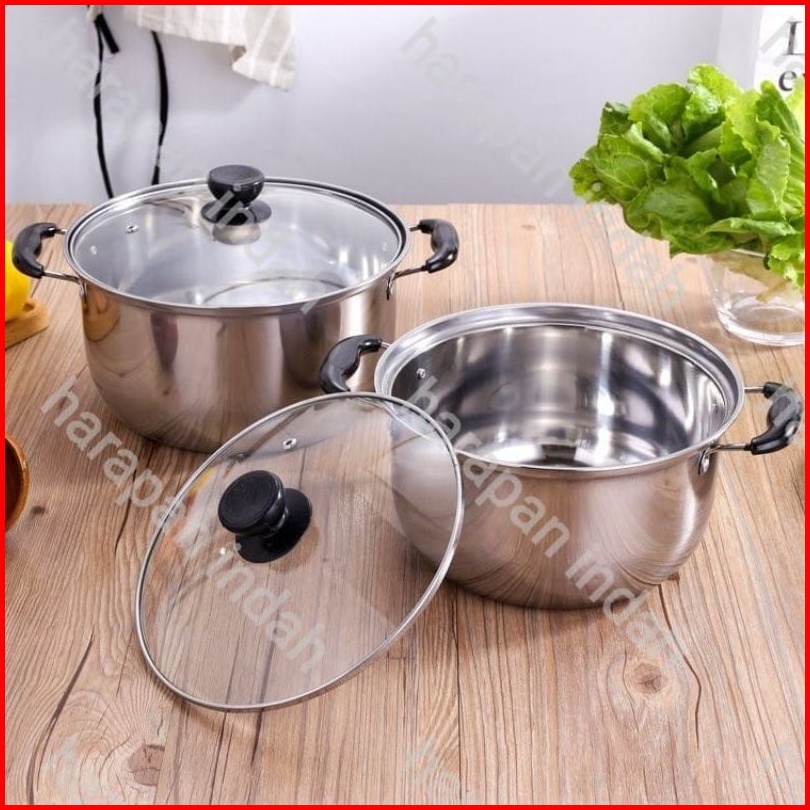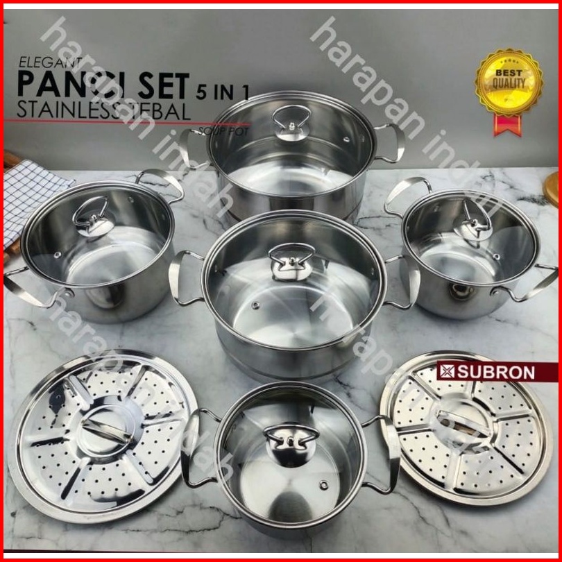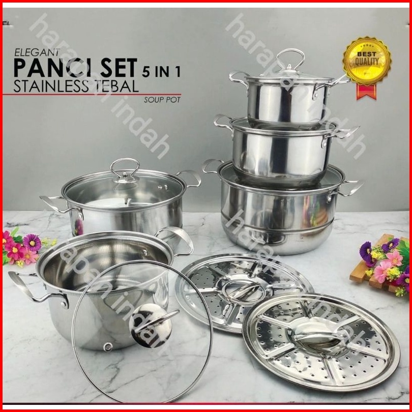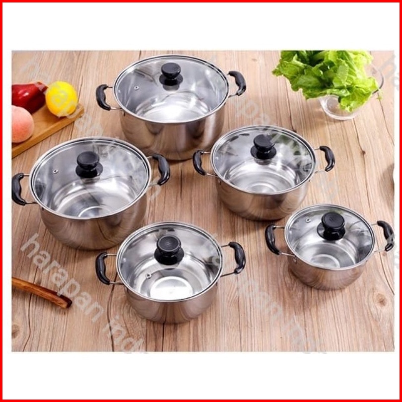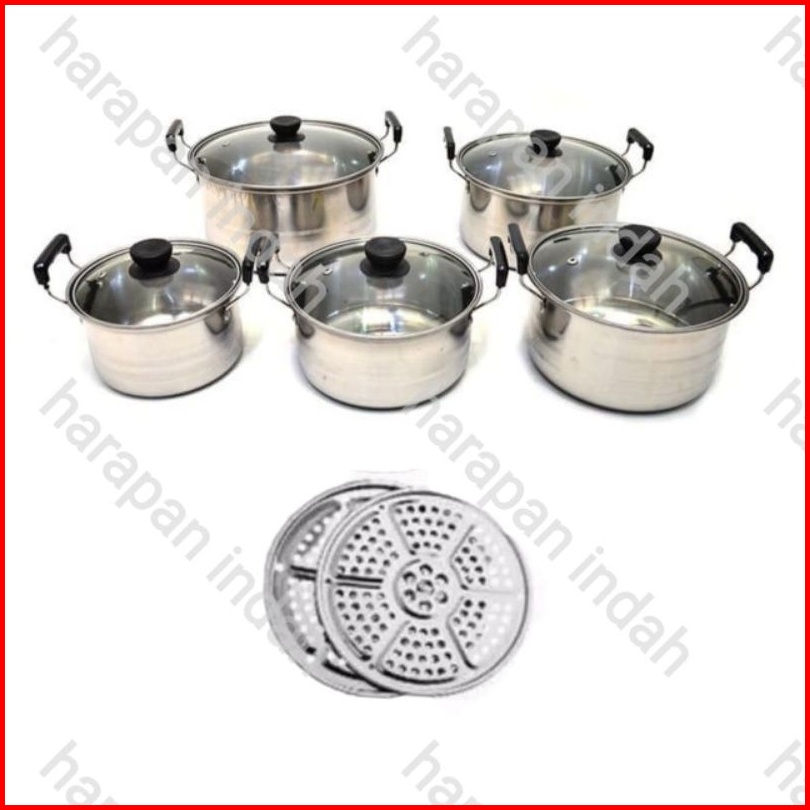 Panci Set Isi 5 Pcs Stainless Tutup Kaca Steamer Kukusan 2pcs