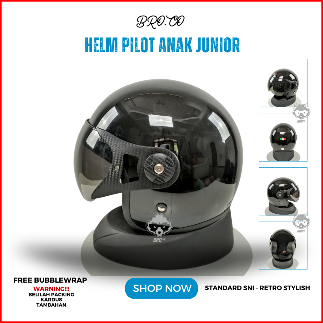 Helm Pilot Retro Italy Anak Anak Junior Half Face Hitam Black Glossy Standard Sni Premium Brokids Bro.co Untuk Laki-laki
