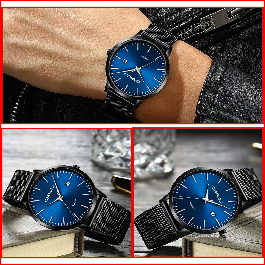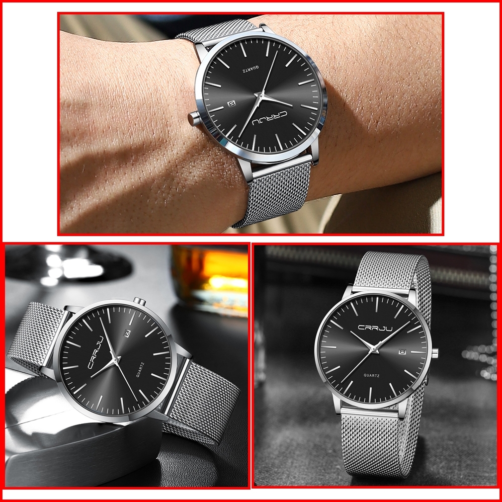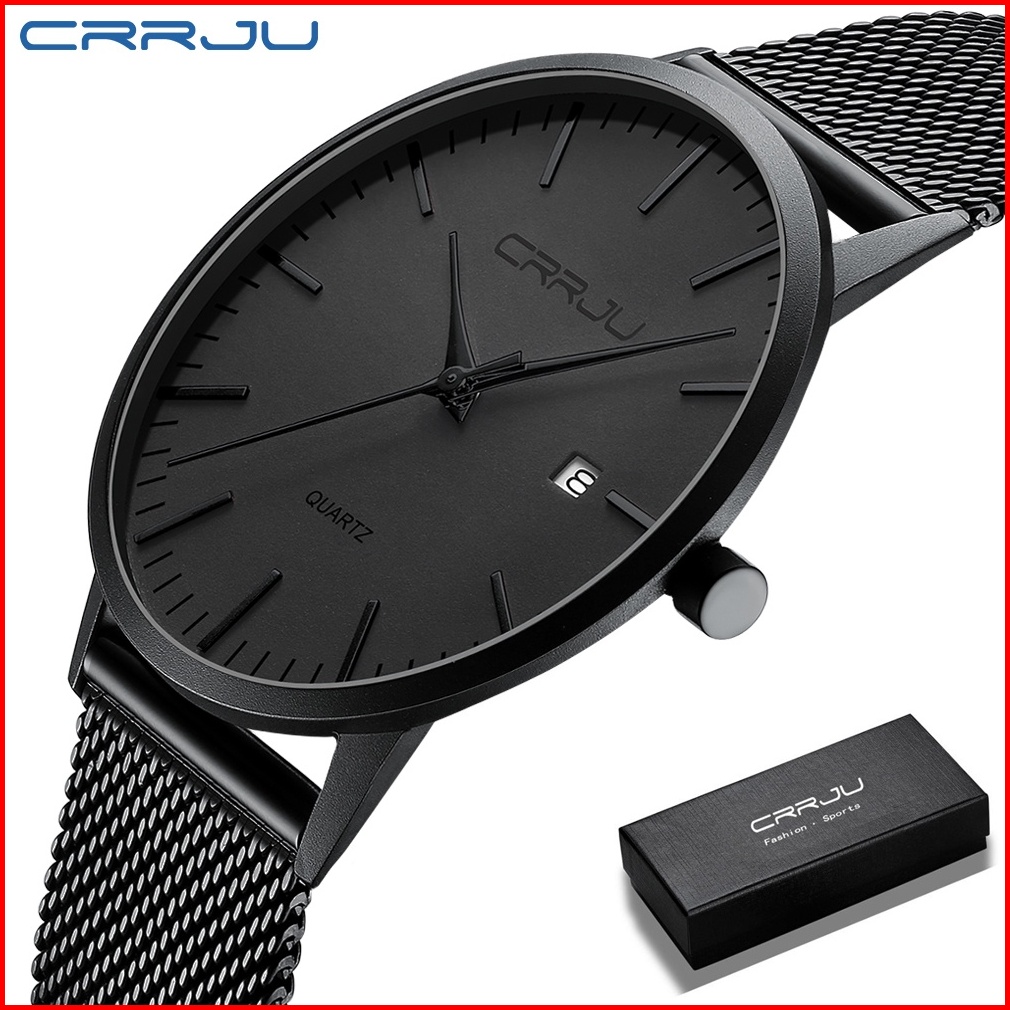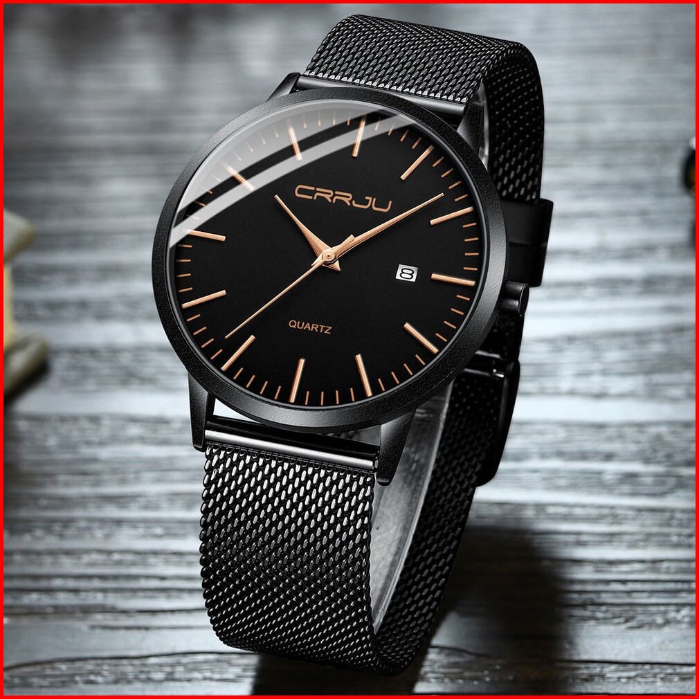 Jam Tangan Pria Crrju Merek Mewah Modis Kuarsa Ultra Tipis Baja Jaring Tali Tahan Air Jam Tangan Cowok
