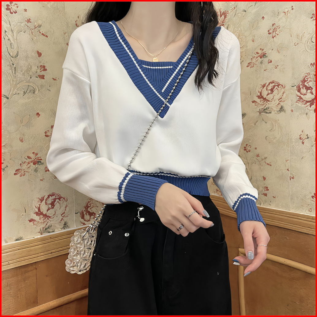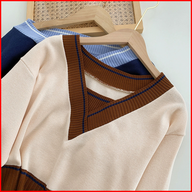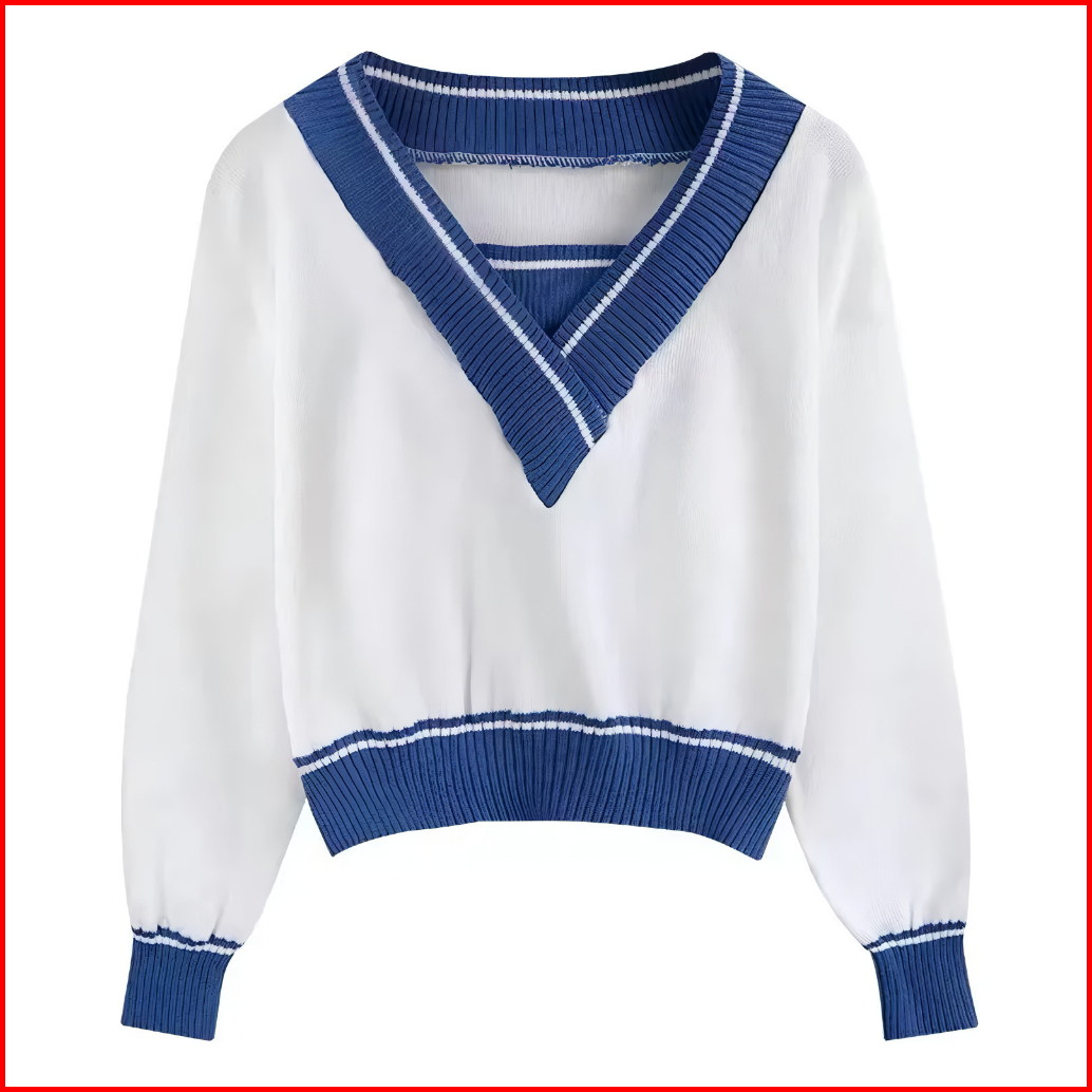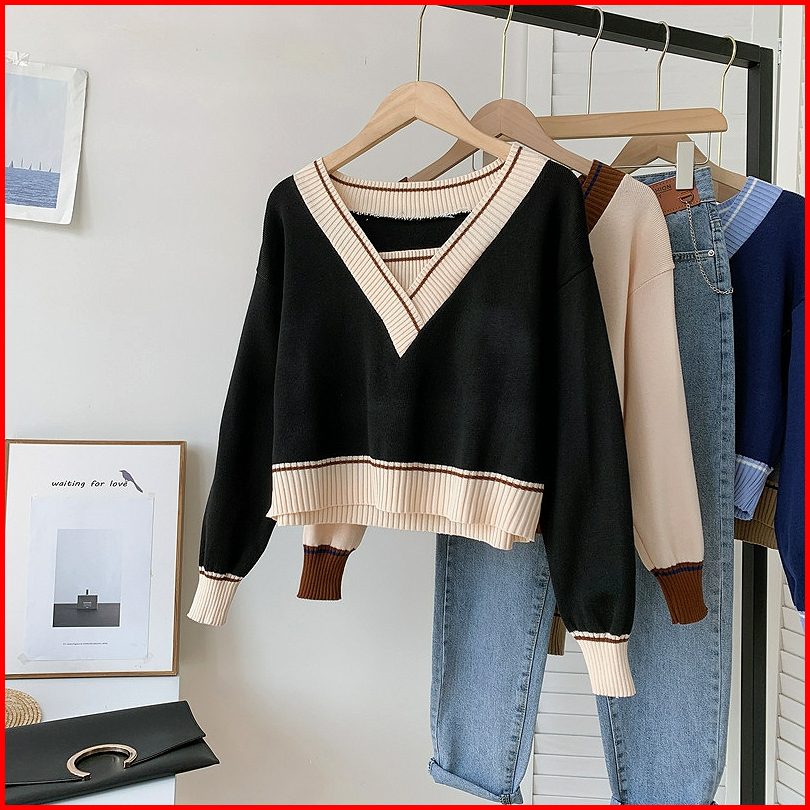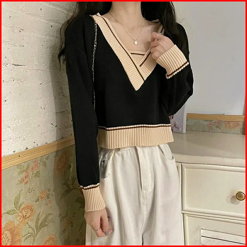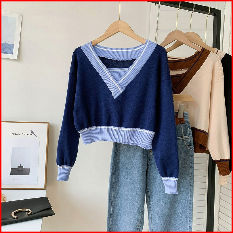 Sweater Rajut Knit Crop Top Leher V Garis-garis