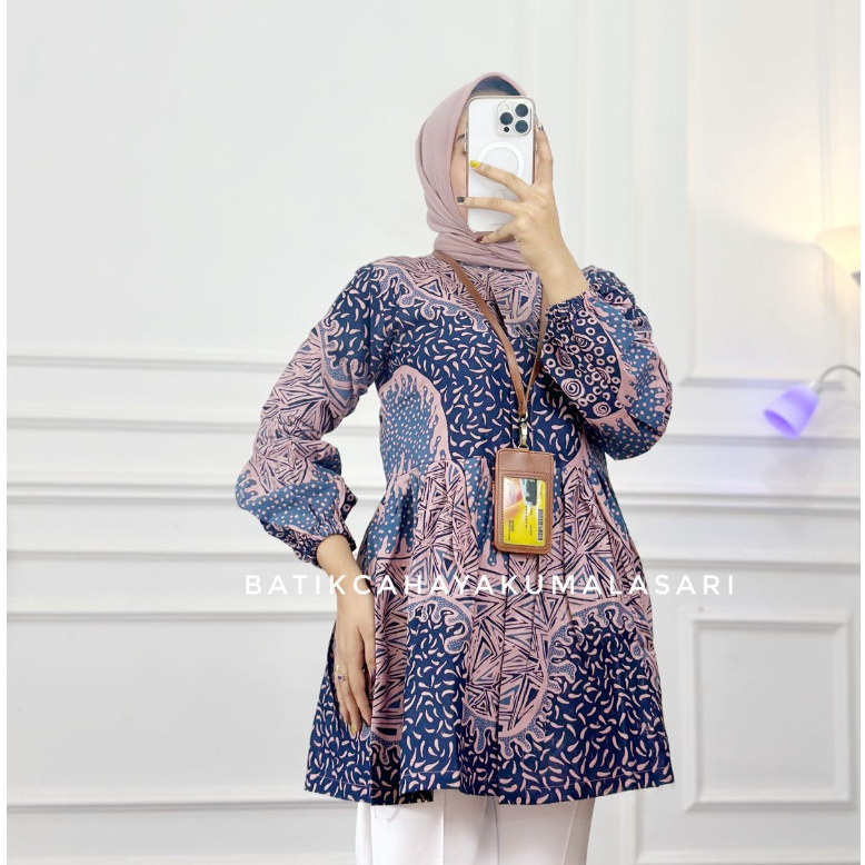 BLOUSE BATIK WANITA LENGAN BALON MOTIF MEDINA BIRU - BAHAN KATUN PRIMA PREMIUM