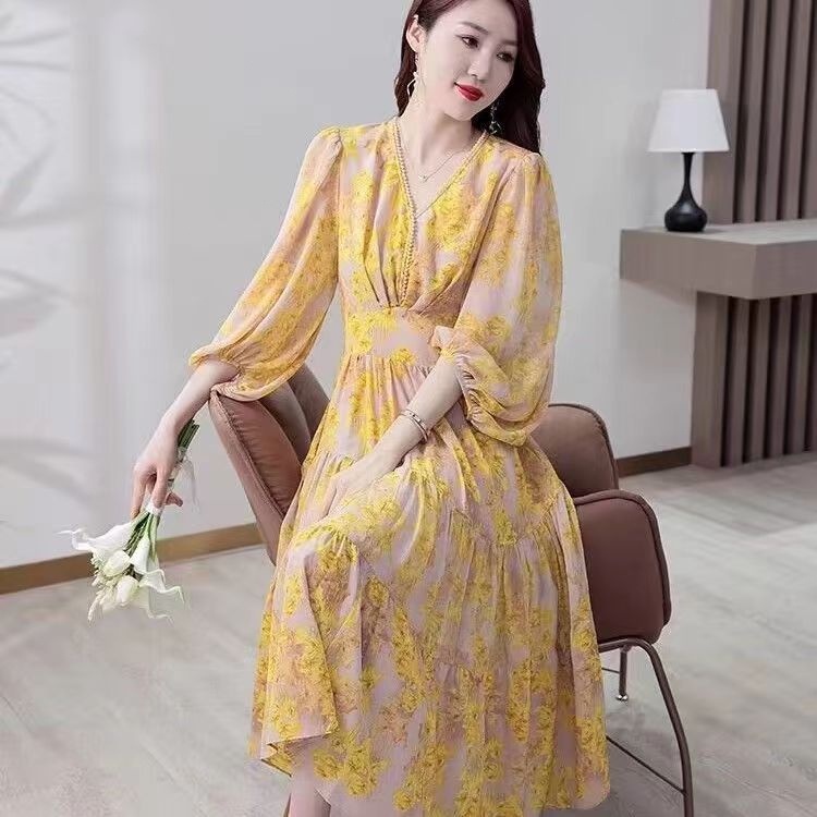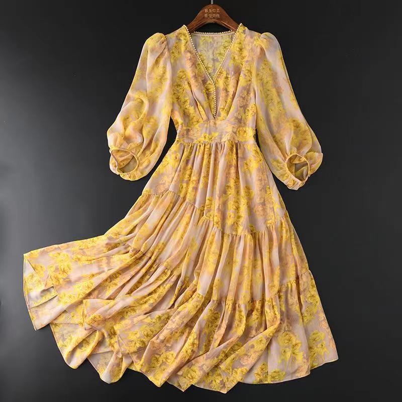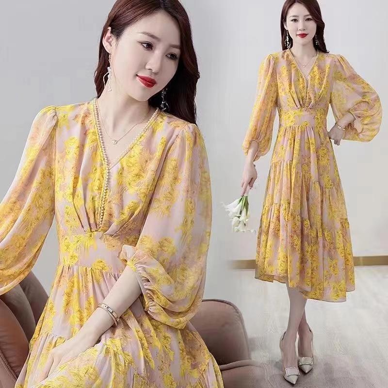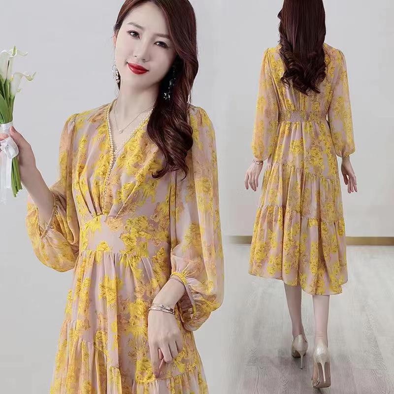 GAUN SIFON KUNING KERAH V BARU GAUN KOREA DRESS PESTA DRESS SIFON