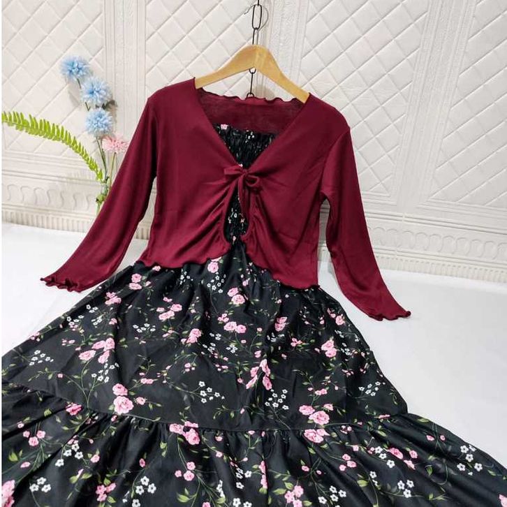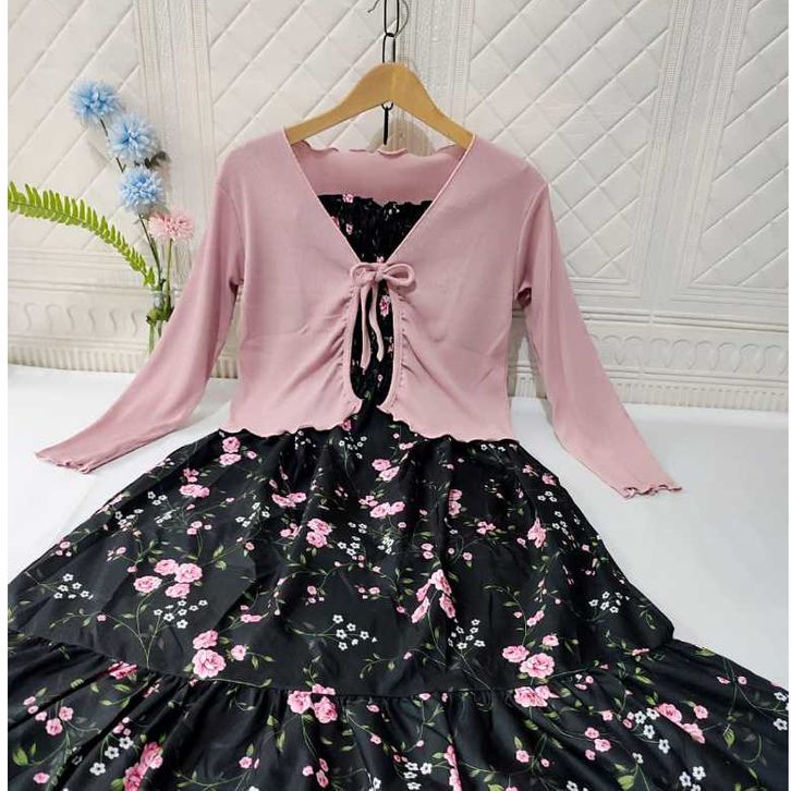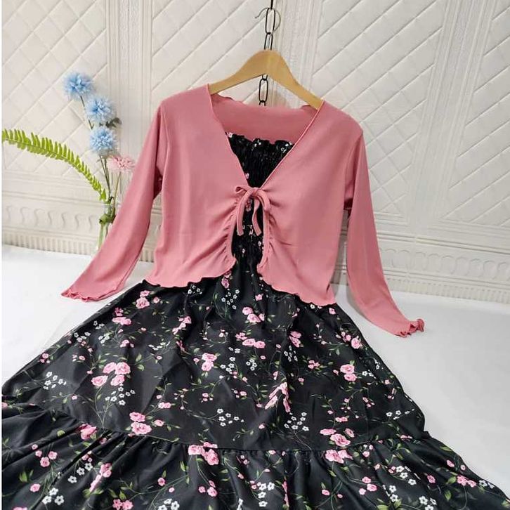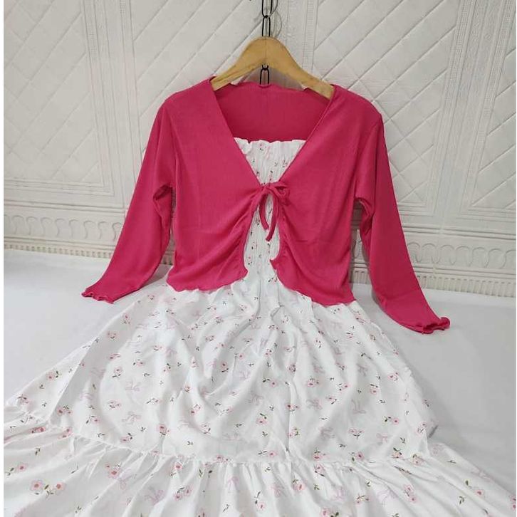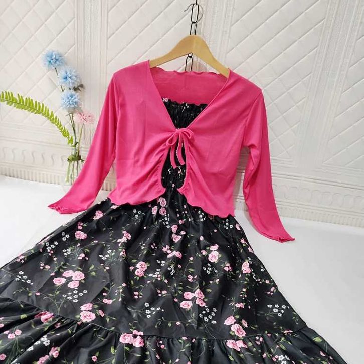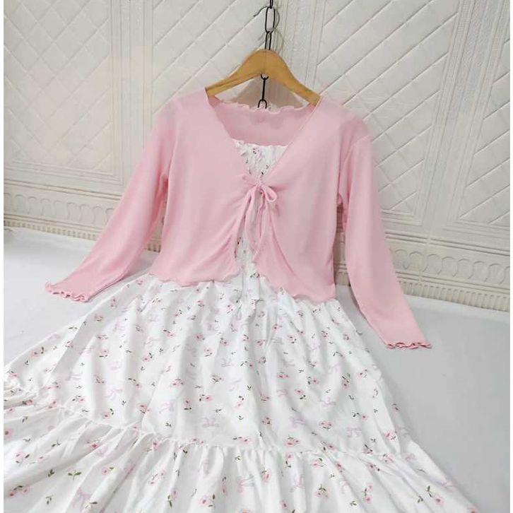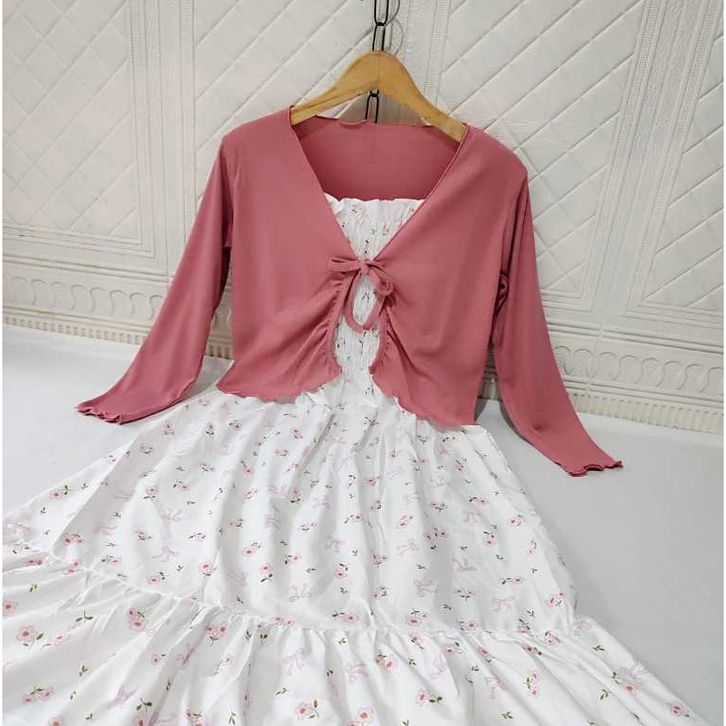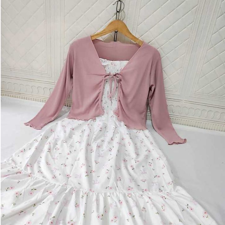 Setelan Wanita Cardigan Rib Knit & Dress Tali/One Set Kekinian