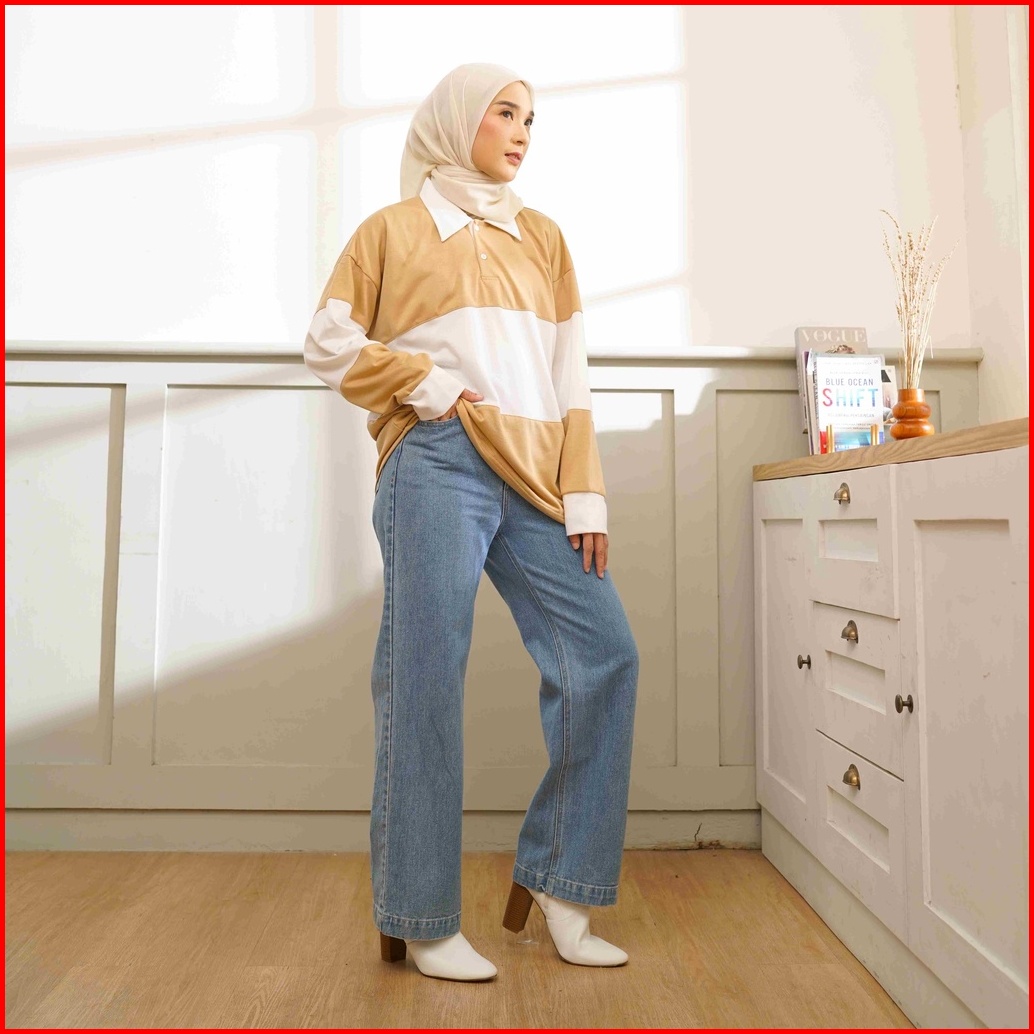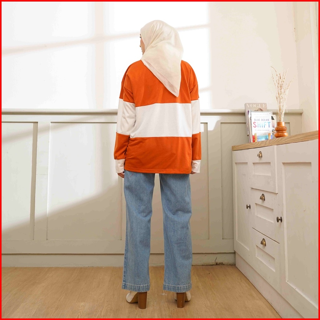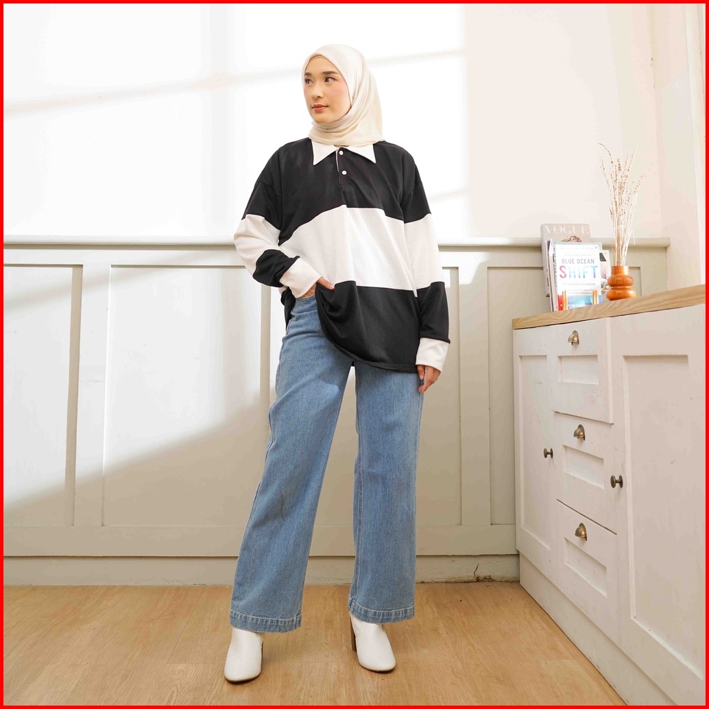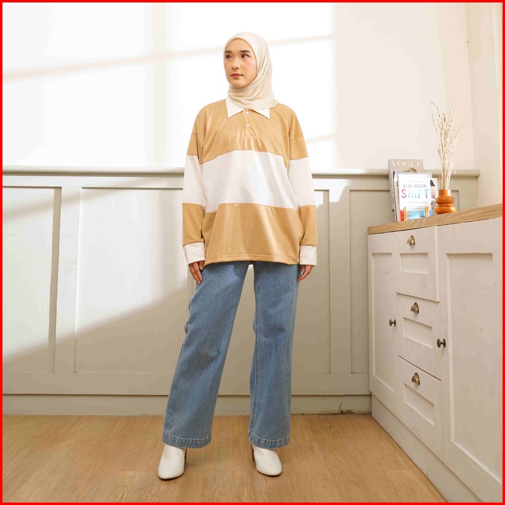 Rugby Shirt Lengan Panjang Polo Shirt Kaos Kerah Kombinasi Wanita