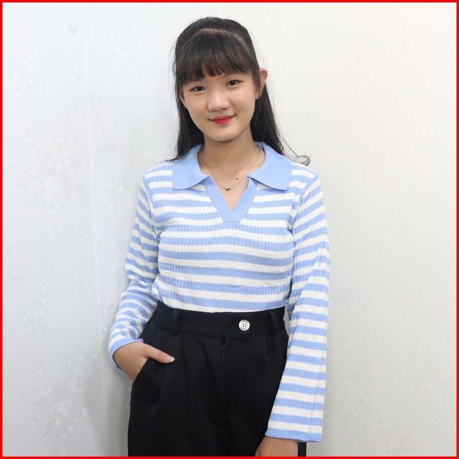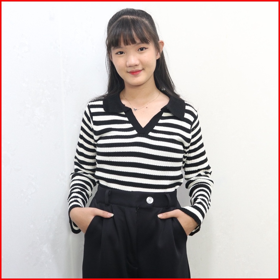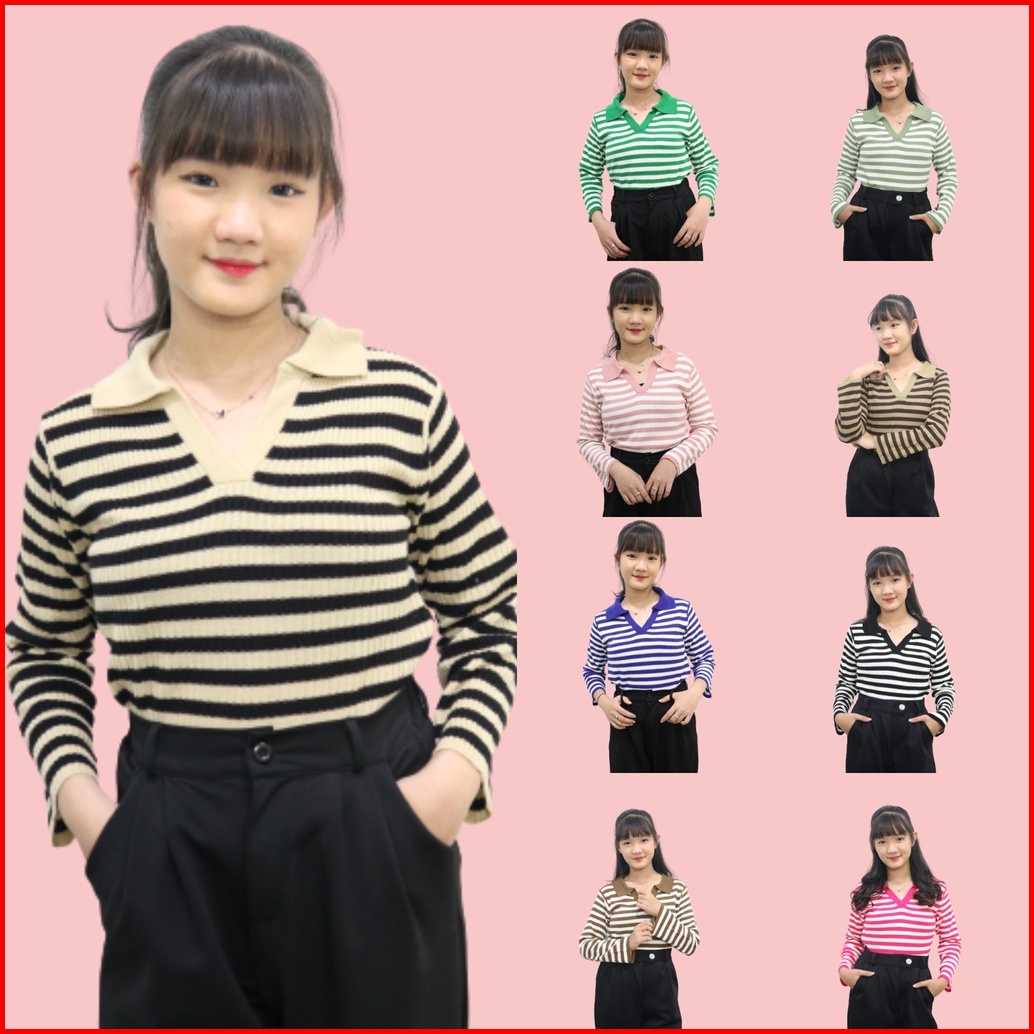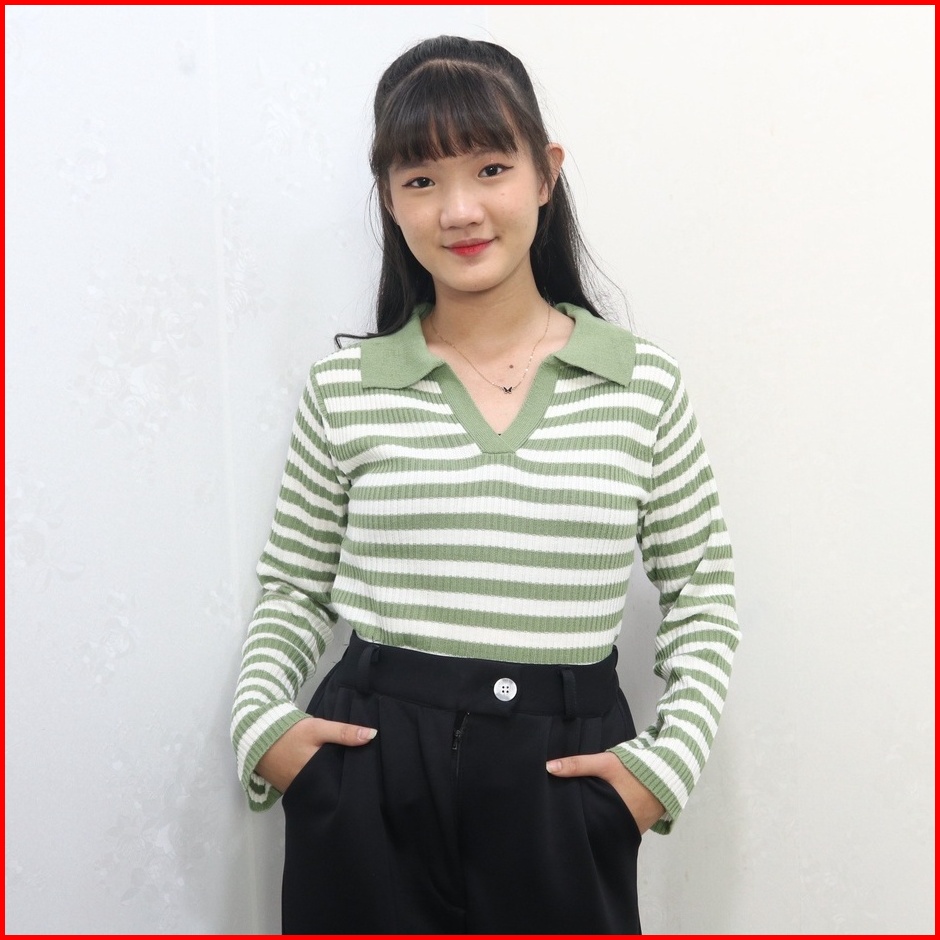Kaos Kerah Rajut Wanita - T-shirt Kra Vneck Salur