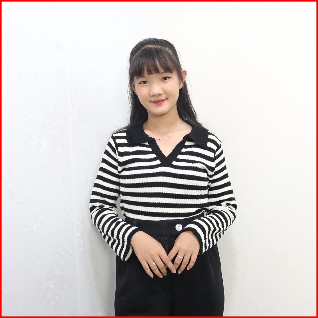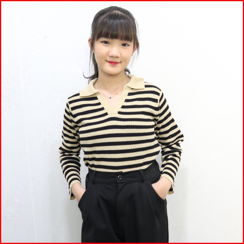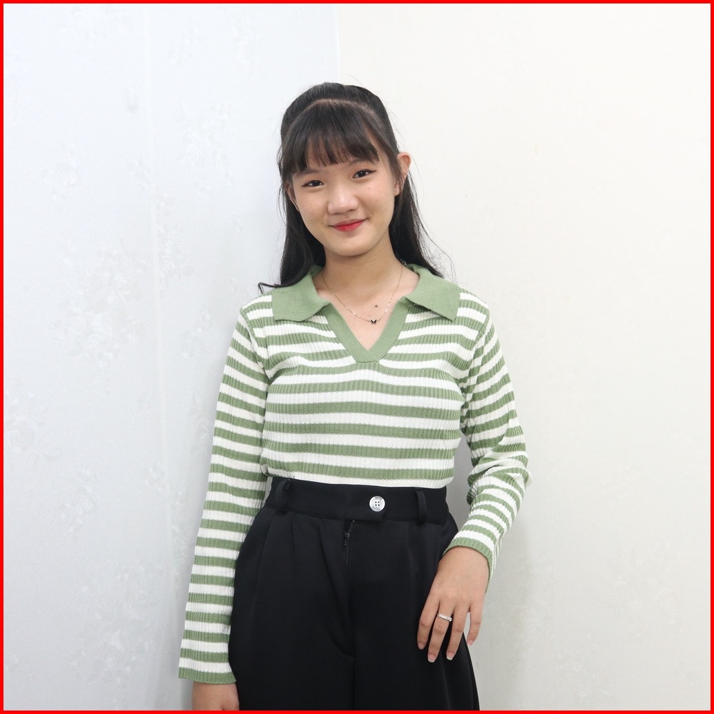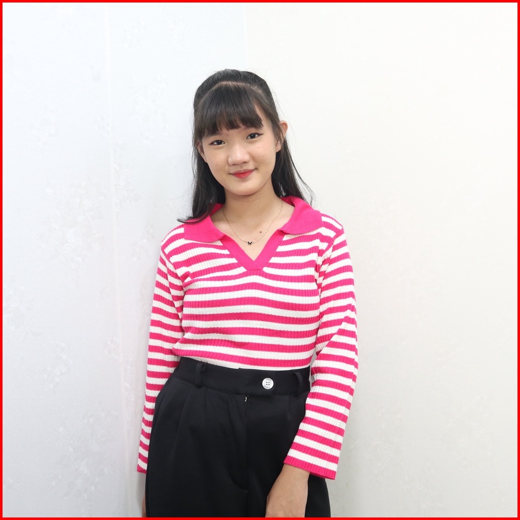 Kaos Kerah Rajut Wanita - T-shirt Kra Vneck Salur