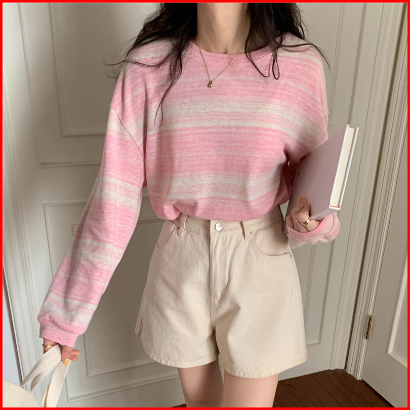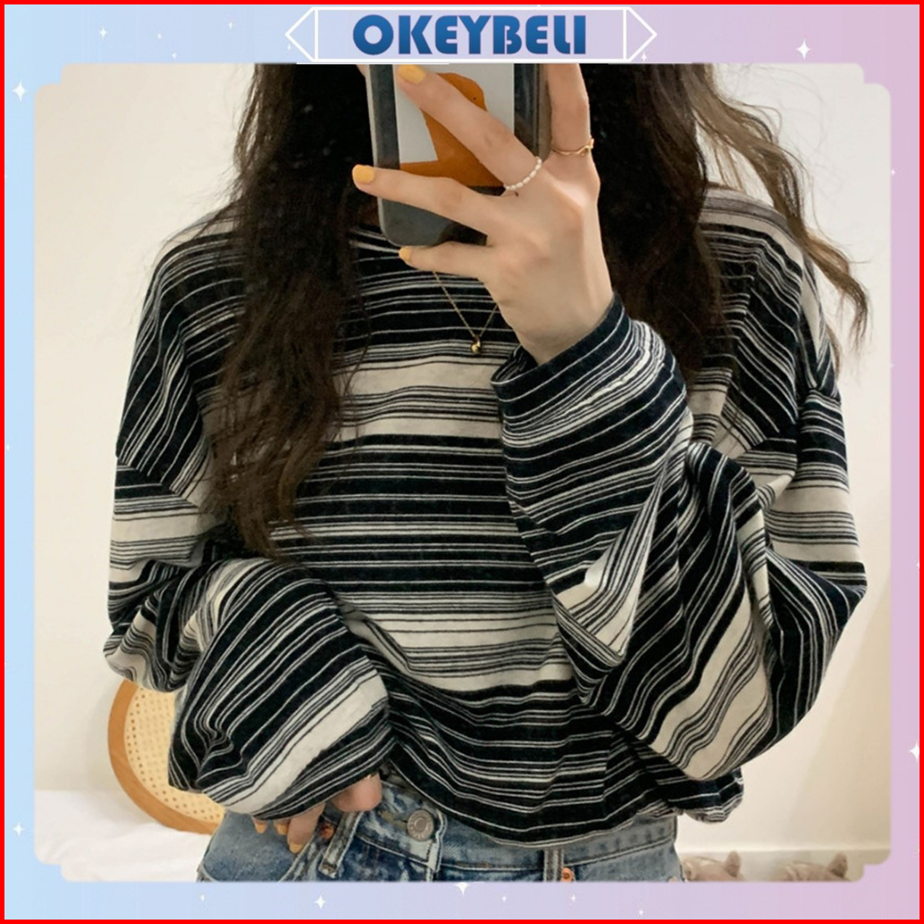 Okey Belibj1216 Baju Atasan Lengan Panjang Kaos Motif Vintage Wanita Kekinian Fashion Korean