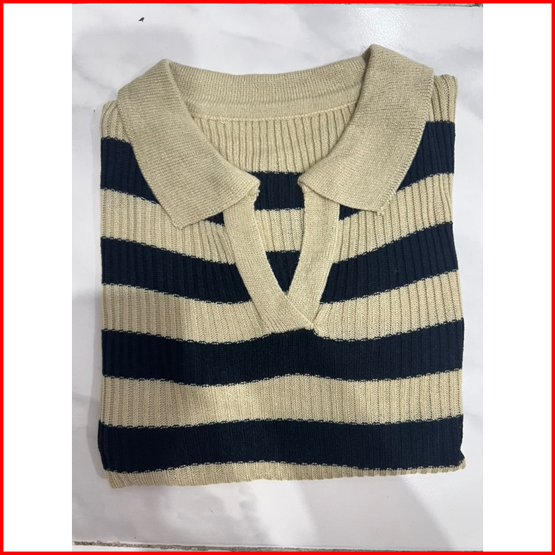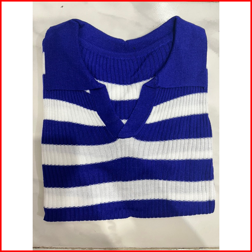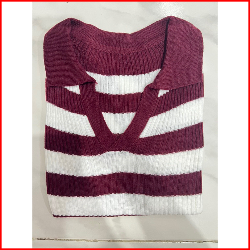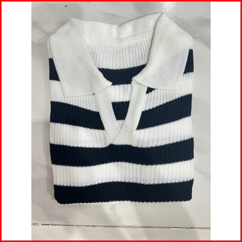 Atasan Kerah Polo Rajut Salur Tali - Vneck Crop Top Blouse Stripe - Polo Shirt Atasan Wanita Korean Style