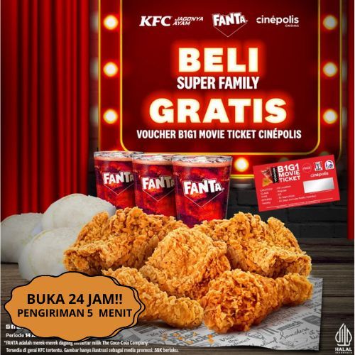 LDR Package, IM Sorry IM Wrong, Zero Rejection, Float Festive, Triple Treat, Serbu Chicken 2, Serbu Burger 2, MDL Chicken Combo, MDL Burger Combo, Jagoan Hemat 1, Jagoan Hemat 2, Jagoan Puas 1, Jagoan Puas 2, Combo Latte 1, Combo Latte 2, Hot Chocolate Nescafe, Iced Chocolate Float Nescafe, Super Komplit 1, Super Komplit 2, Super Komplit 3, Super Komplit 4, Super Family, Super Besar New 1, Super Besar New 2, Kombo OR Burger Single, Kombo OR Burger Double, Kombo Colonel Burger, Kombo Crispy Burger, Kombo Fish Burger, Super Star Single, Super Star Combo 1, Super Star Combo 2, Super Star Combo 3, Chaki Kids Meal A Dessert, Chaki Kids Meal B Dessert, Whole Chicken, Winger Bucket Promo, Snack Bucket BBQ 1, Snack Bucket BBQ 2, 1 Pc Chicken, KFC Winger, Crispy Strips, OR Burger Single, Chick Ball BBQ, Winger BBQ, Fun Fries, OR Burger Double, Colonel Burger, Fish Burger, Spaghetti Supreme, Twisty, French Fries Reguler, French Fries Large, Perkedel, Rice, Tote Bag, Cream Puff 1 Pcs, Cream Puff 2 Pcs, Pudding, KFC Soup, Mango Float, Cream Soup, Spaghetti deluxe, Yakiniku Don, Crispy Burger, Oriental Don, Mocha Float, Yubari Float, Sprite Float, Fanta Float, Cola Float, Coca Cola Zero Medium, Ice Cappuccino Float, Jagoan Hemat 1,