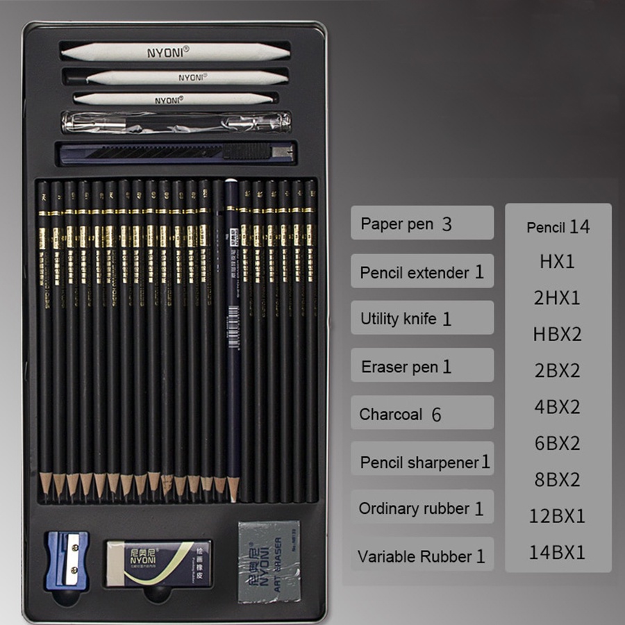NYONI DRAWING PENCIL GAMBAR SET 29PCS METAL TIN BOX PENSIL GAMBAR LUKIS SKETSA LENGKAP PAKET