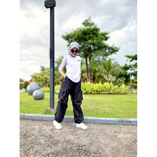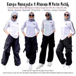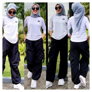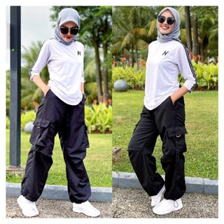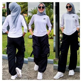 Baju Setelan Senam Aerobic Mix Match Cargo Harajuku Hitam Parasut Atasan N Petir Putih Spandek Baju Olahraga Wanita
