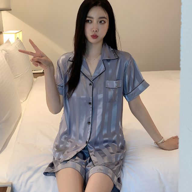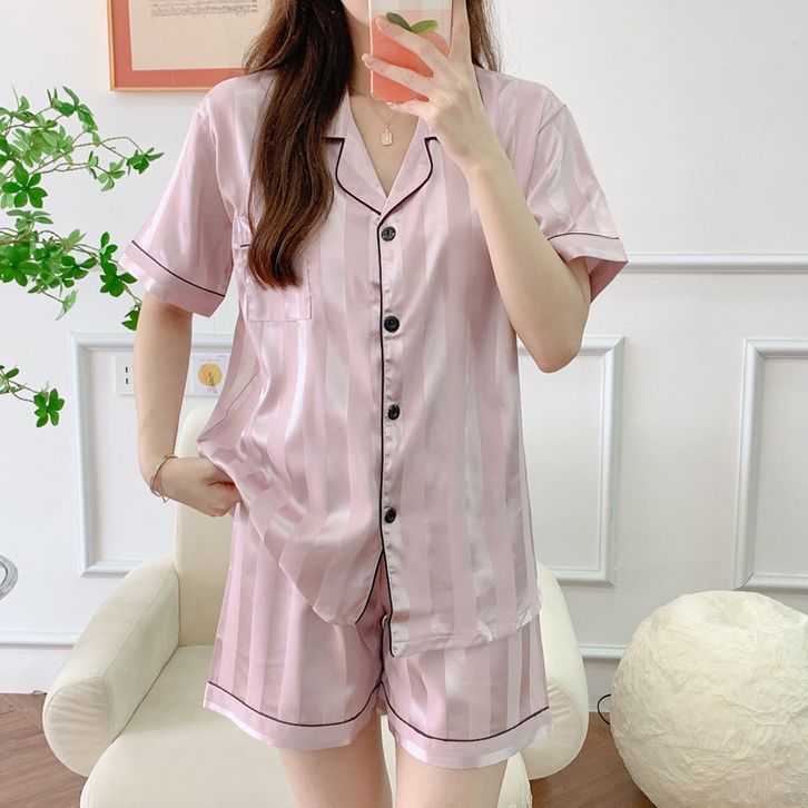 2023 garis-garis vertikal baru sutra es sutra piyama wanita baju pendek lengan pendek setelan pakaian rumah