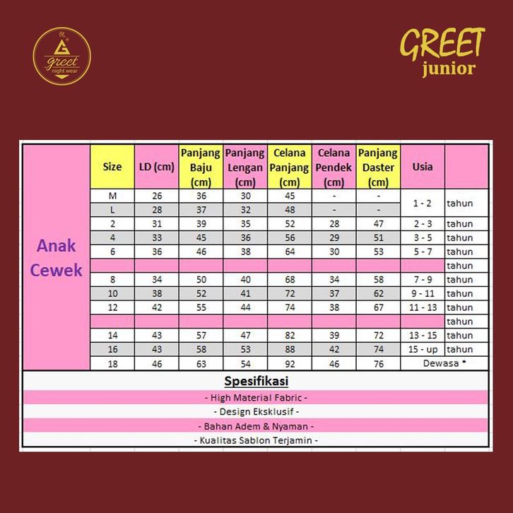 GREET NIGHT WEAR - Piyama Anak Perempuan Kaos Katun M0Del : GL-017 / H 2-4-6