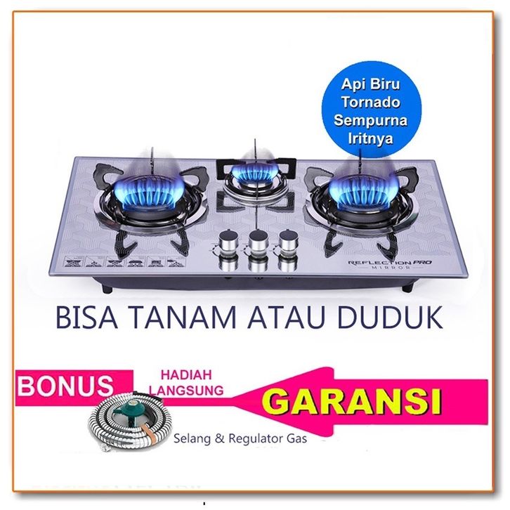 Niko Kompor Gas 3 tungku seri PRO Reflection mirror Tempered Glass Bisa Tanam atau Duduk +SELANG