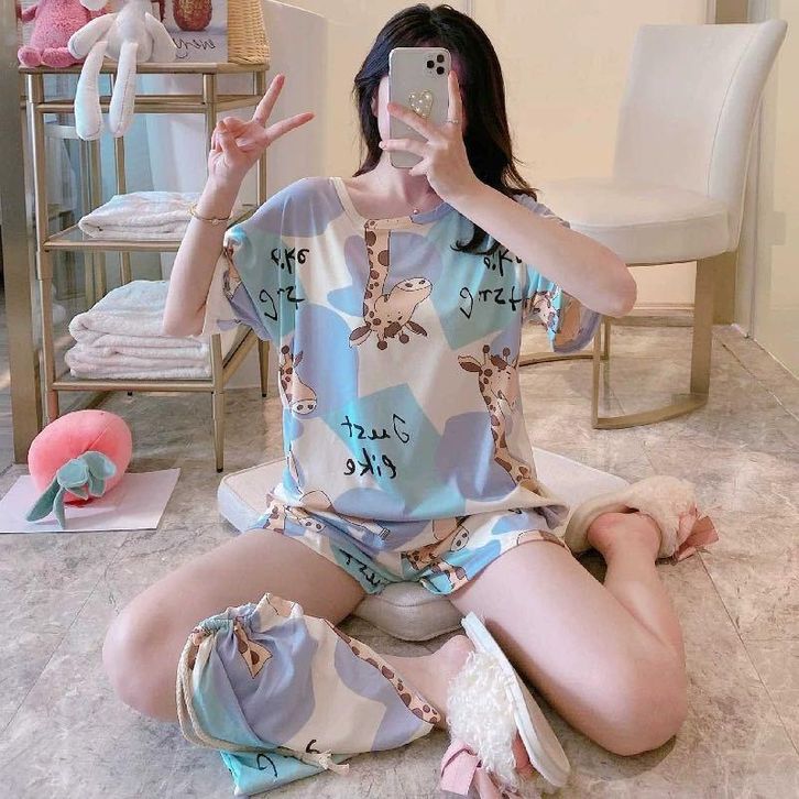 MS Baju tidur wanita setelan piyama lengan dan celana pendek motif karakter kartun lucu bahan katun kaos lembut korea st