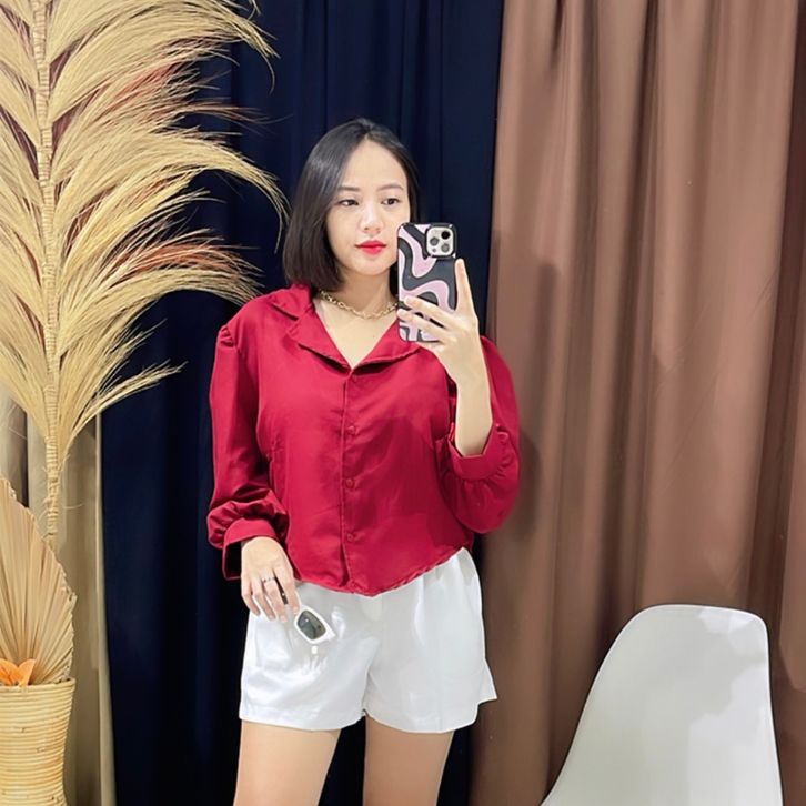 Kemeja Crop Top Blouse Puff Cotton Gangnam Kekinian - Baju Kameja Wanita Termurah dan Terbaru Jumbo Tanpa DP