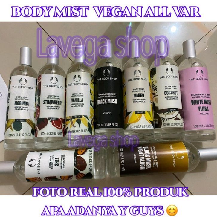 BODY MIST VEGAN BODY SHOP 100ML BLACK MUSK, VANILA,SHEA,MORINGA,MANGO,STRAWBERY gratis ongkir tanpa dp