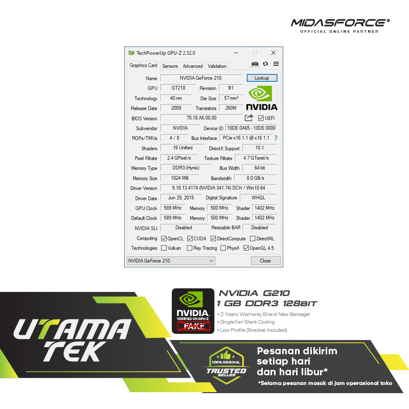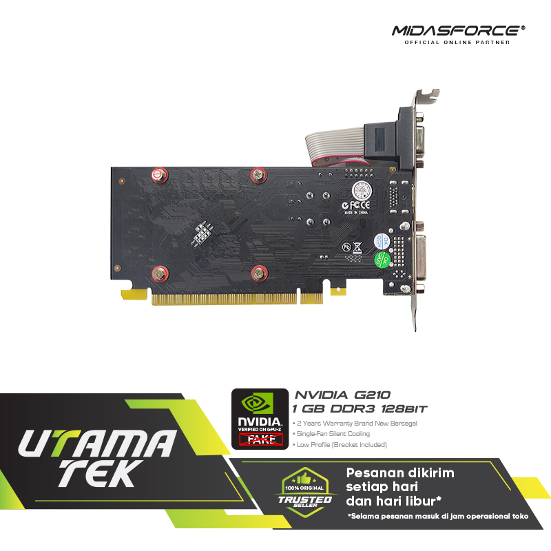 VGA NVIDIA MIDASFORCE G210 DDR3 64BIT 1GB LP GARANSI 2 TAHUN