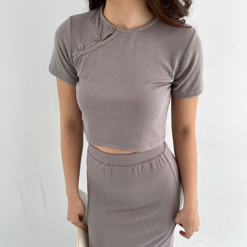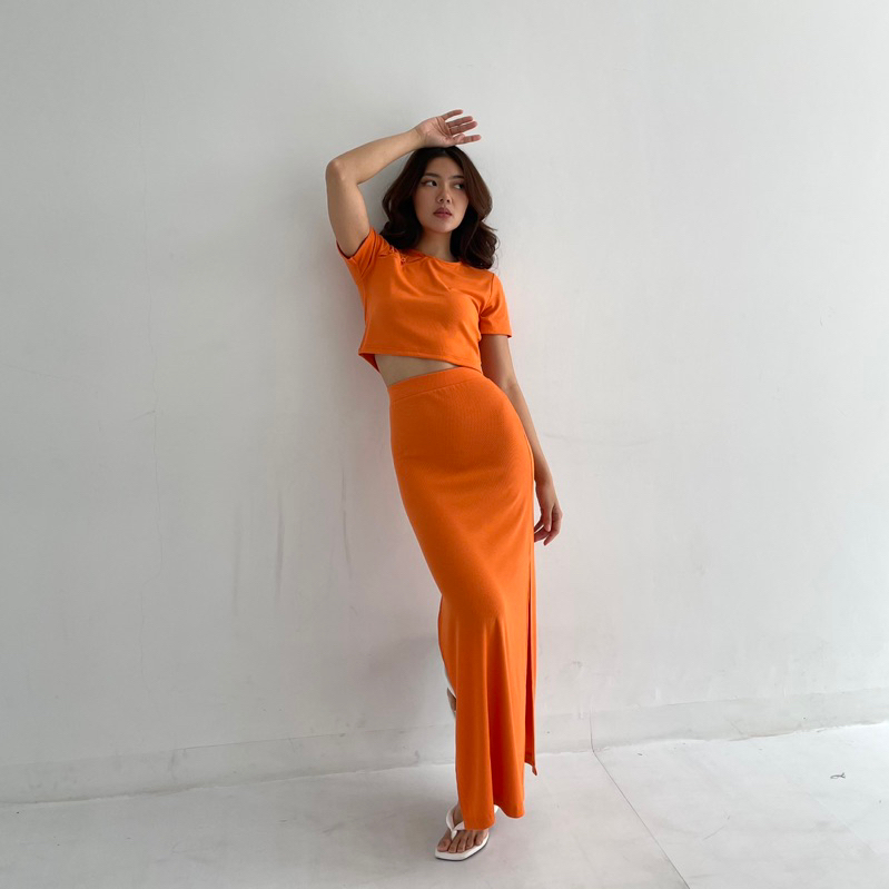 LISBON SET | SETELAN WANITA ROK PANJANG RIBBED KNIT SET CROP T0P MIDI SKIRT KOREAN LONG SKIRT CROP LENGAN PENDEK