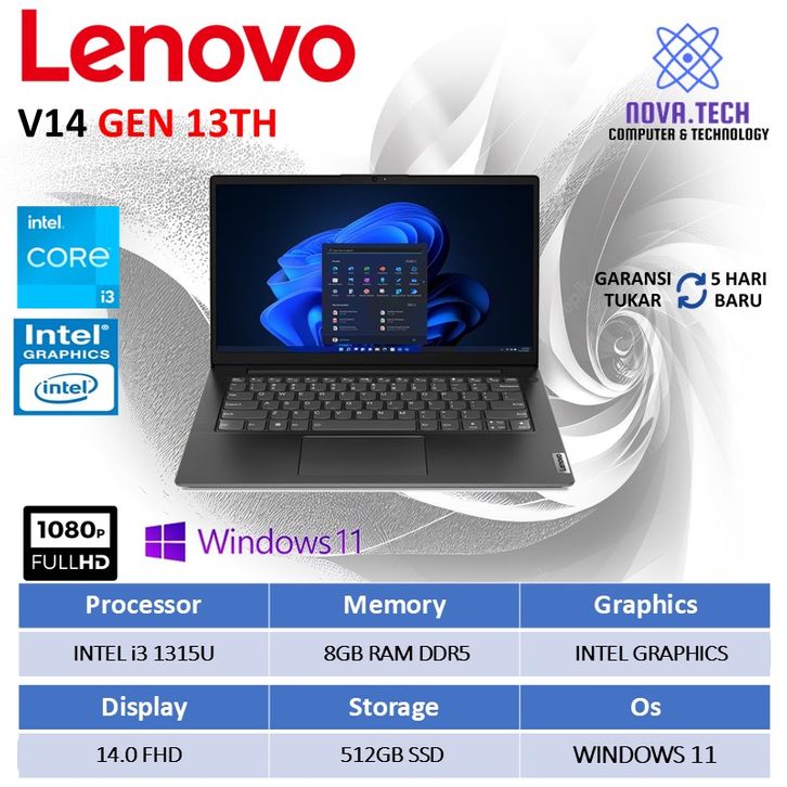Lenovo V14 G5 Laptop Core i3 -1315 Ram 8GB ssd 256GB 14 inch Windows 11 GEN 13th Baru Garansi resmi