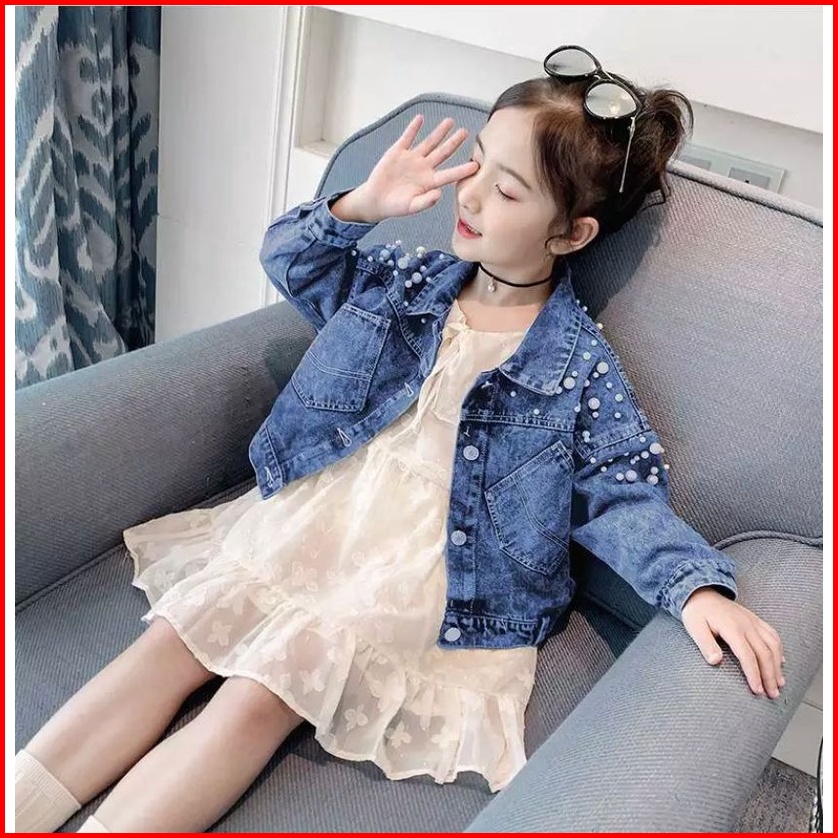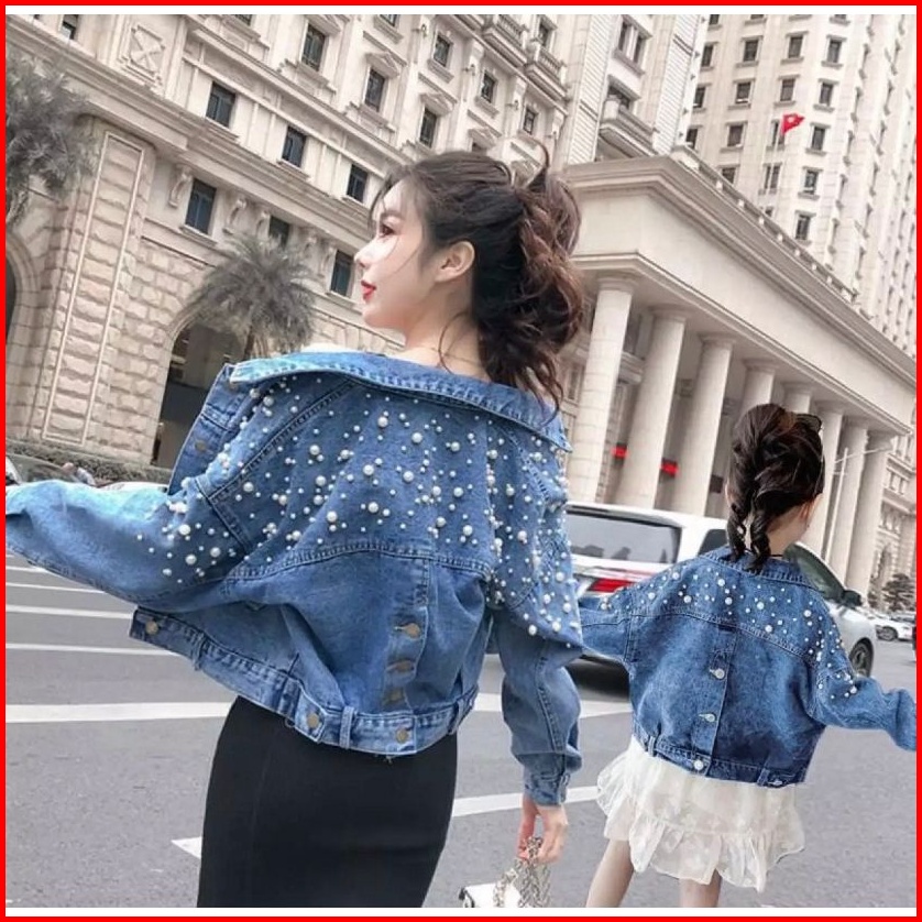Jaket Jeans Wanita Anak Dan Dewasa Kombinasi Mutiara Tembak