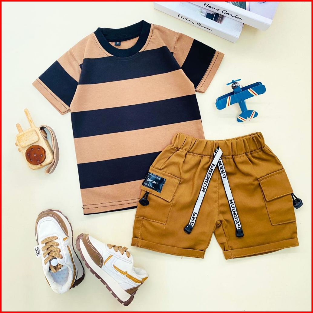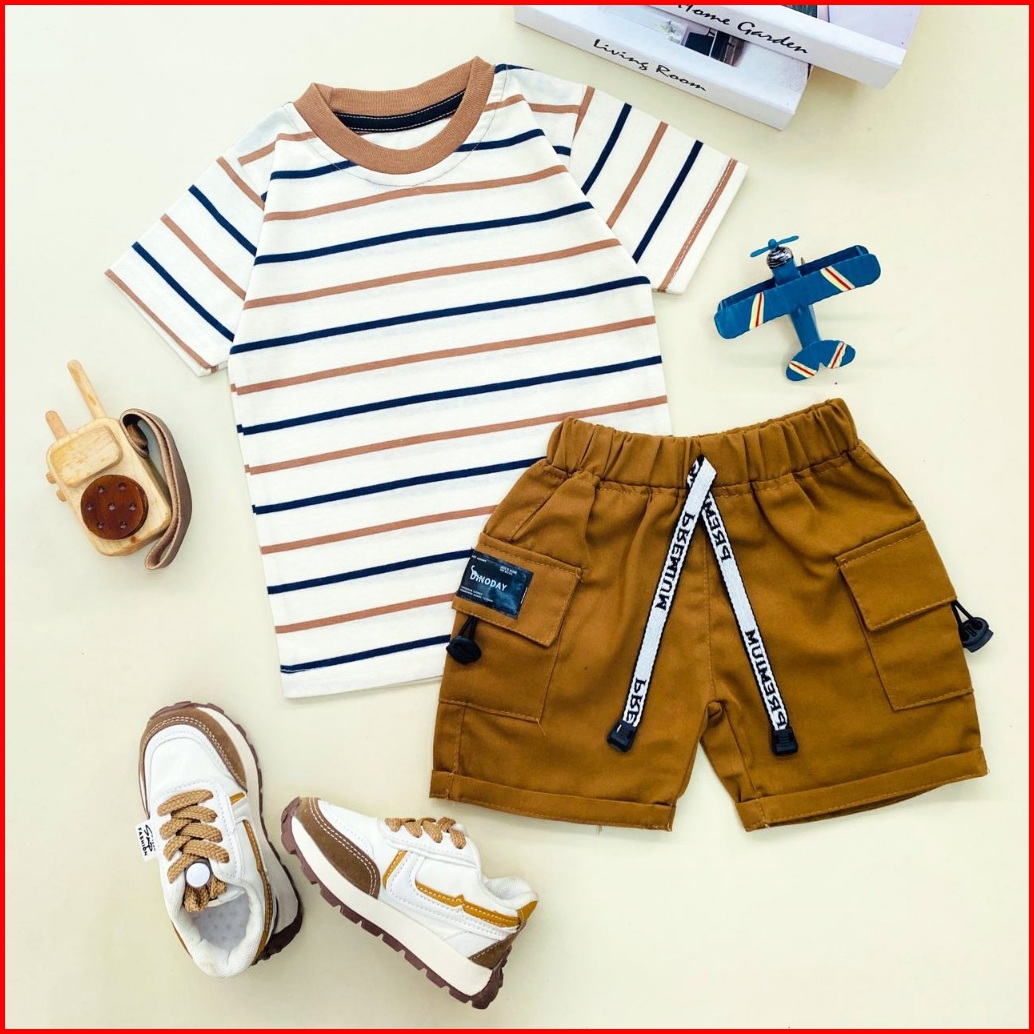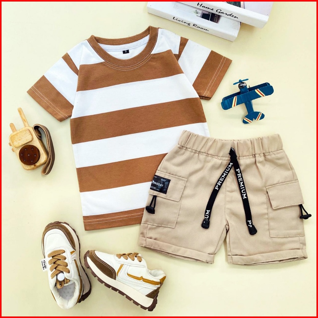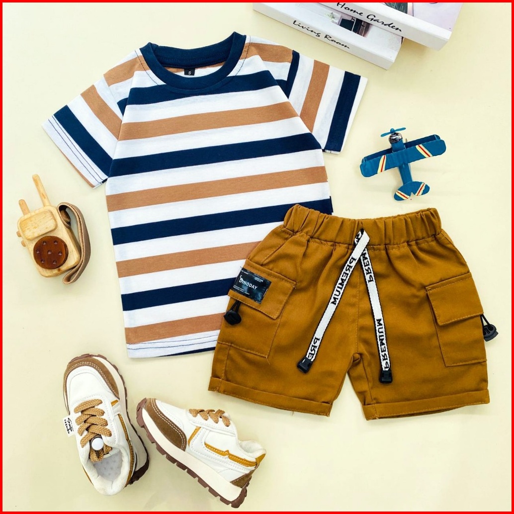 Estishop Setelan Baju Kaos Salur Stripe Anak Laki Laki Perempuan Celana Pendek Cargo Korean Style