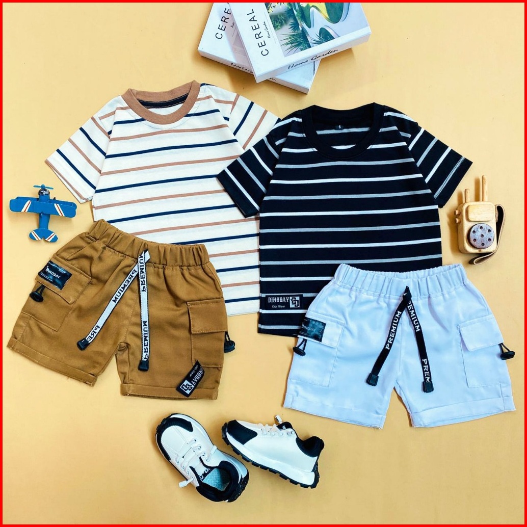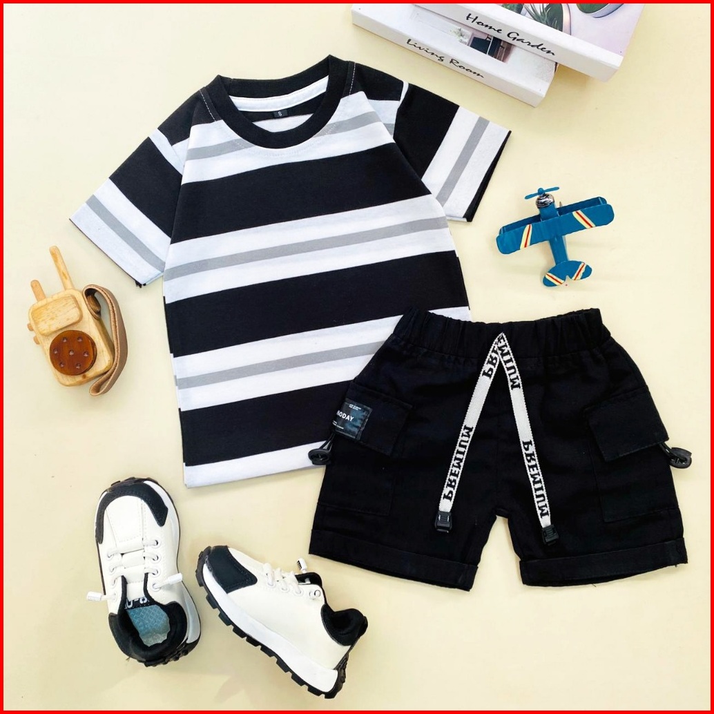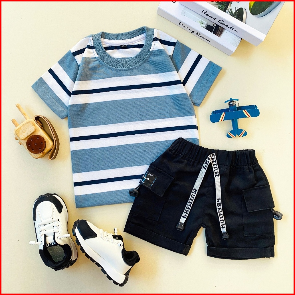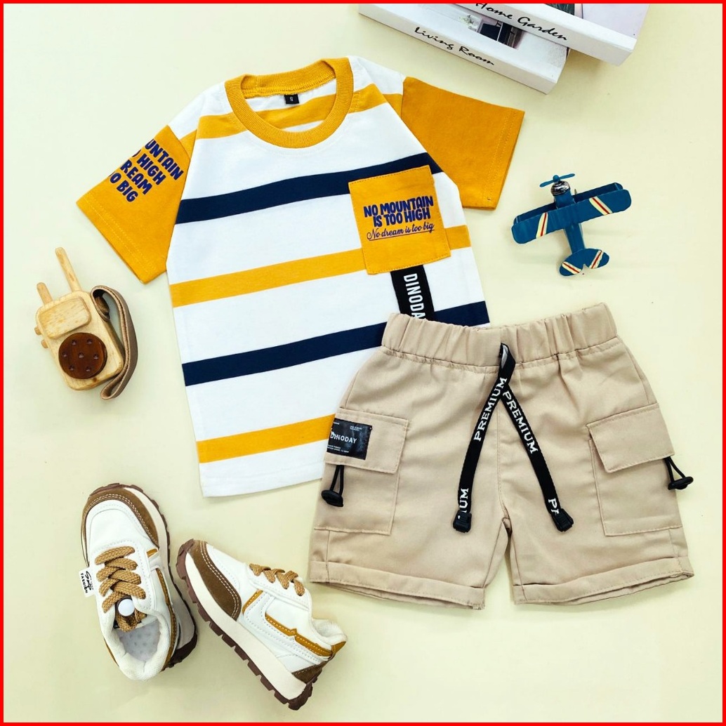 Estishop Setelan Baju Kaos Salur Stripe Anak Laki Laki Perempuan Celana Pendek Cargo Korean Style