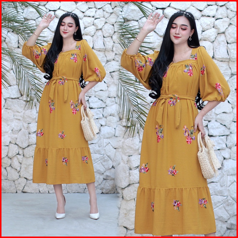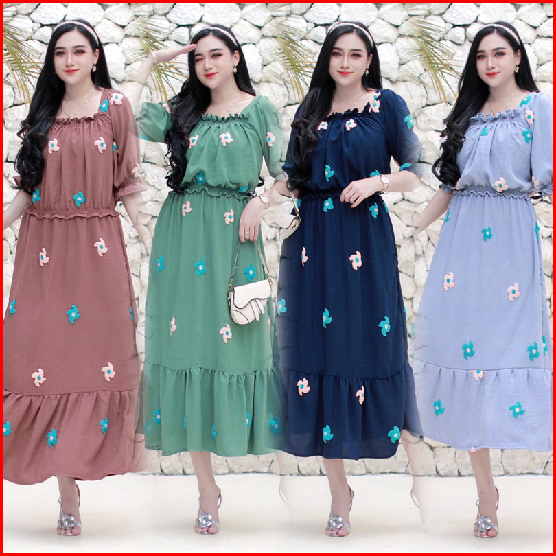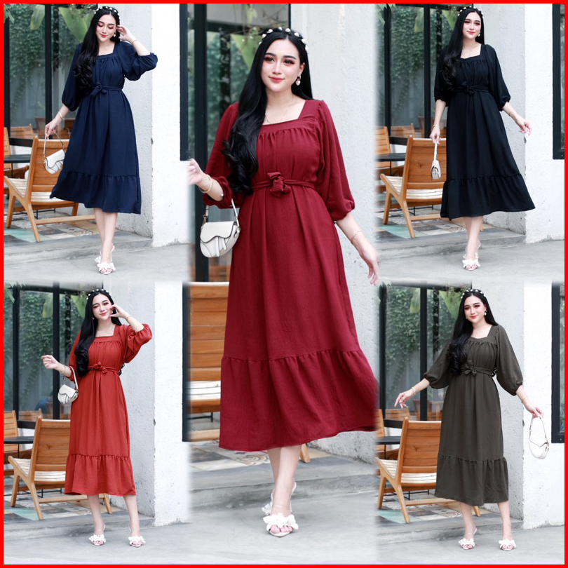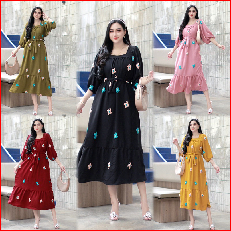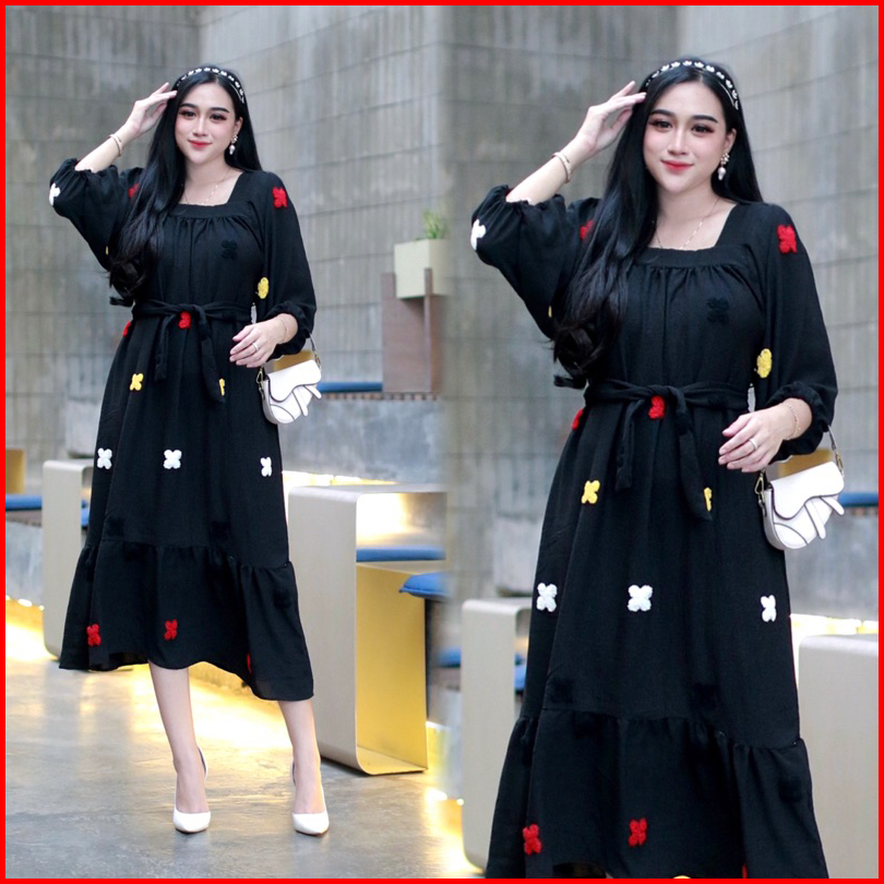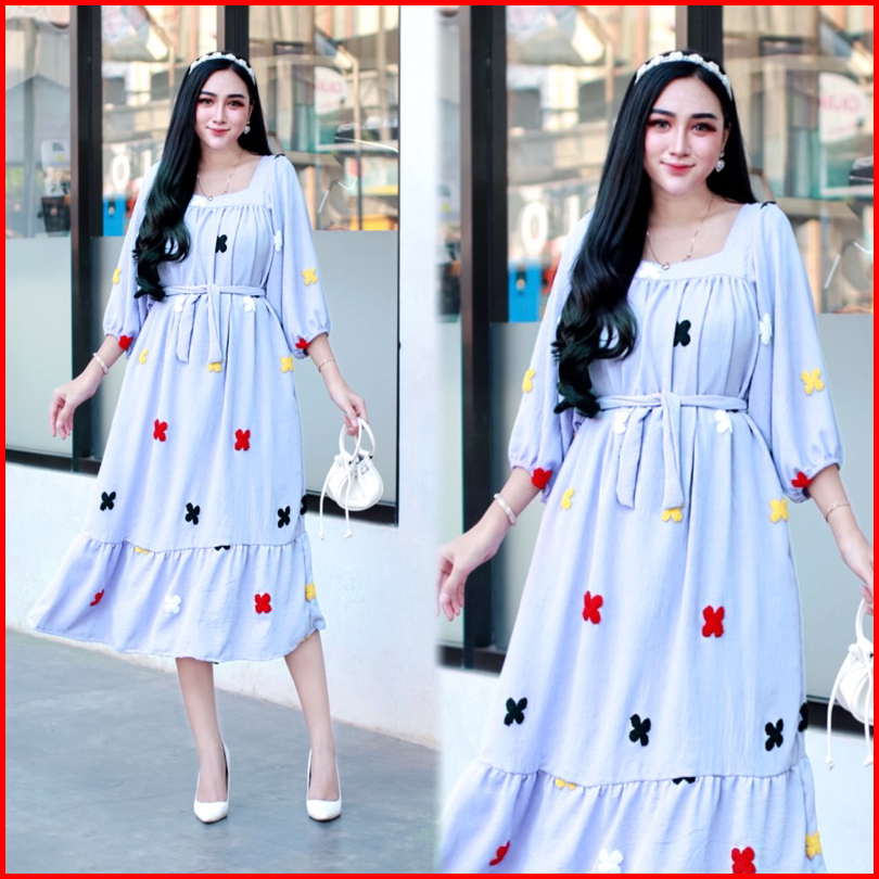 Daster Ruffle Starla Dress Pompom Bahan Cringkle Airflow Pom Pom Motif