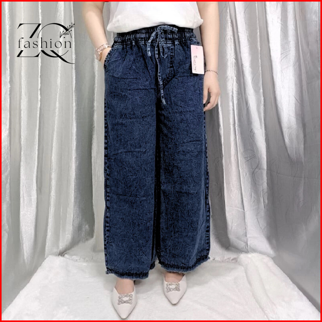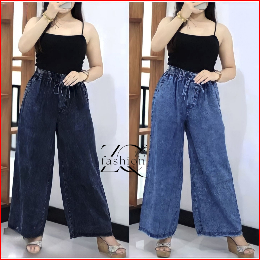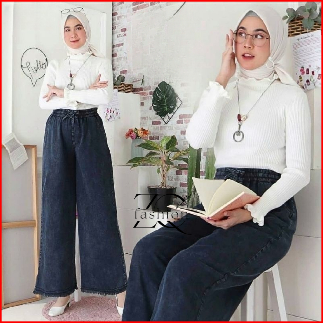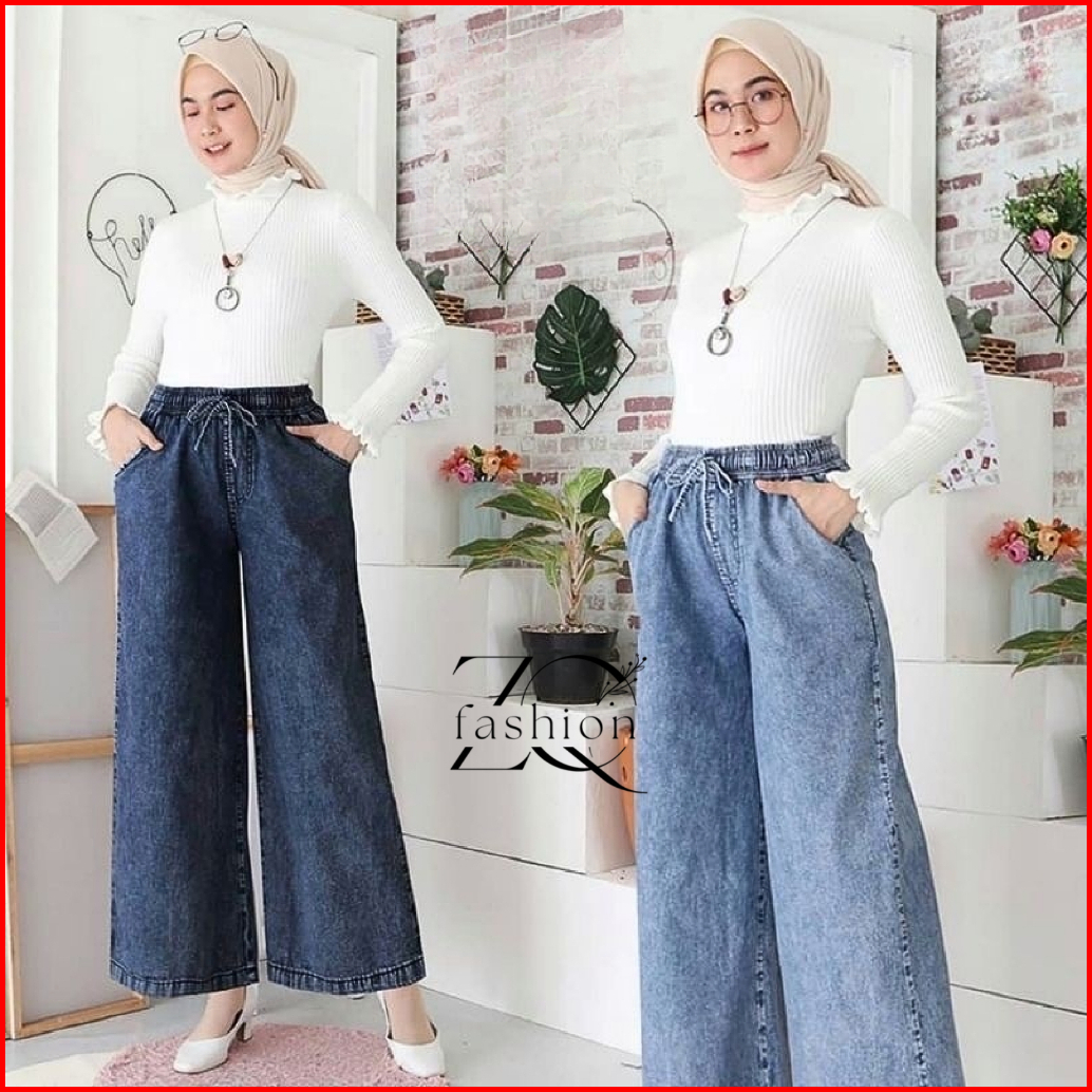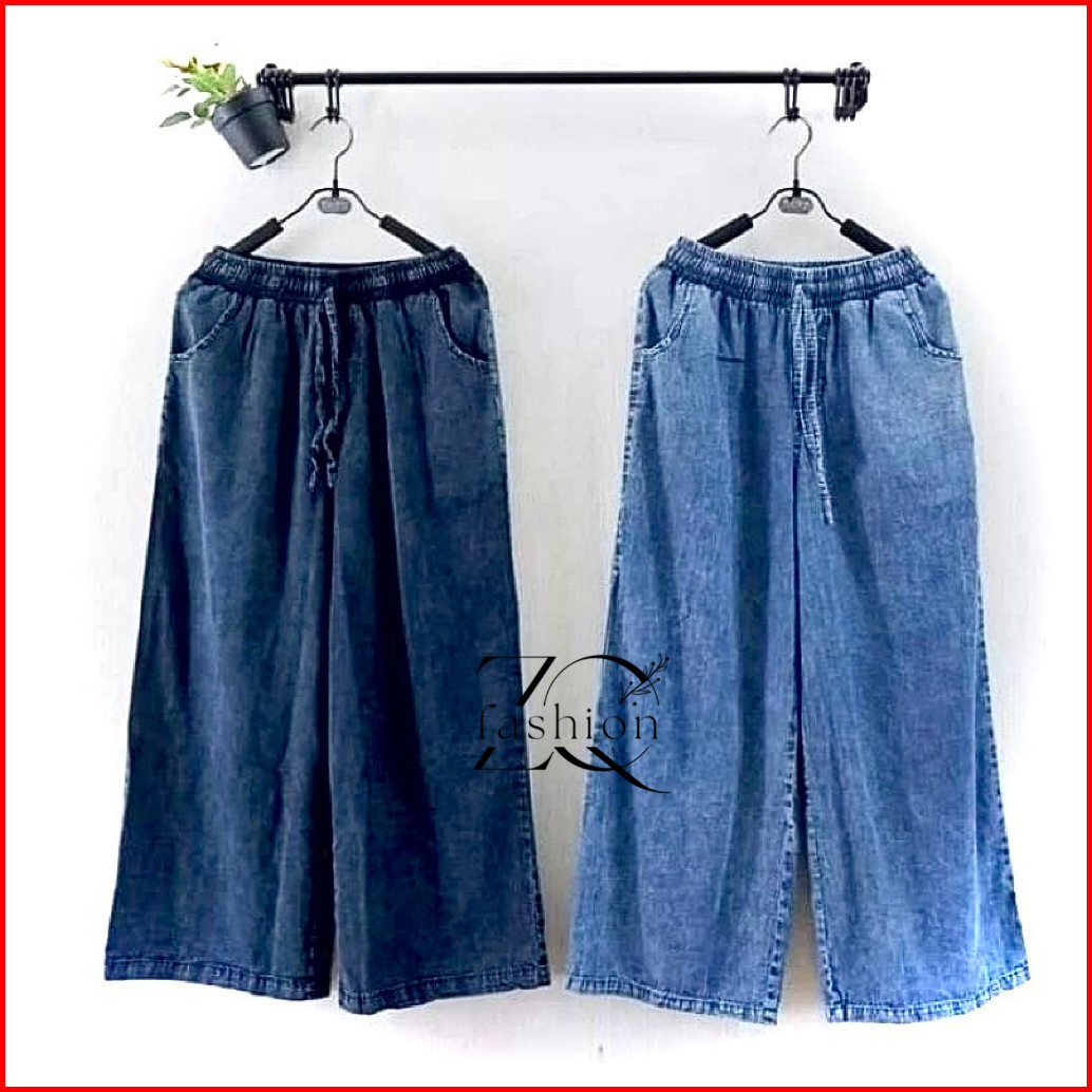 Kulot Jeans Pinggang Karet - Celana Panjang Jeans Kulot Wanita Full Pinggang Karet Tali Serut