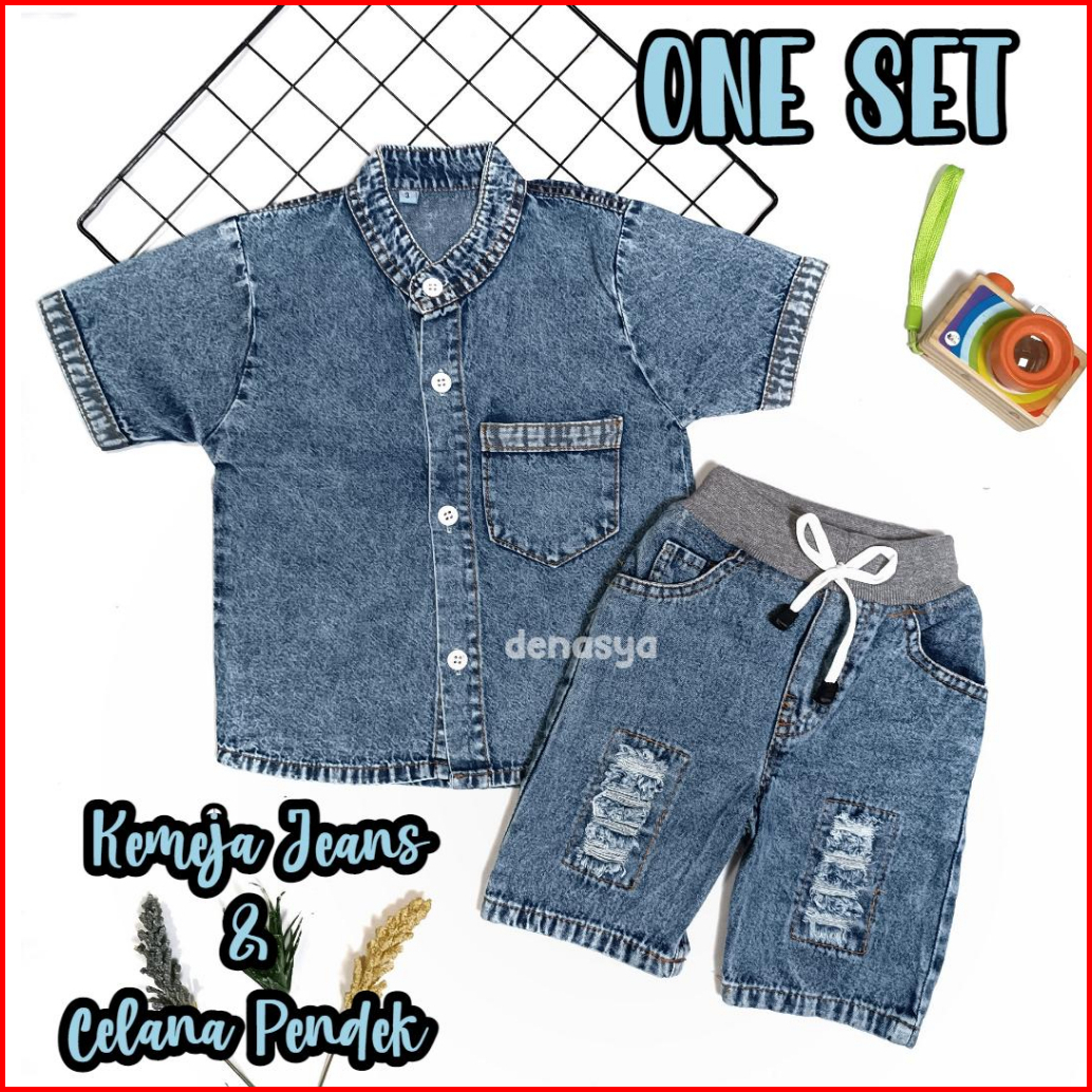 Setelan Jeans Anak Laki-laki Kemeja Jeans Anak Sand Wash Celana Sobek Pendek Anak Usia 1-8 Tahun